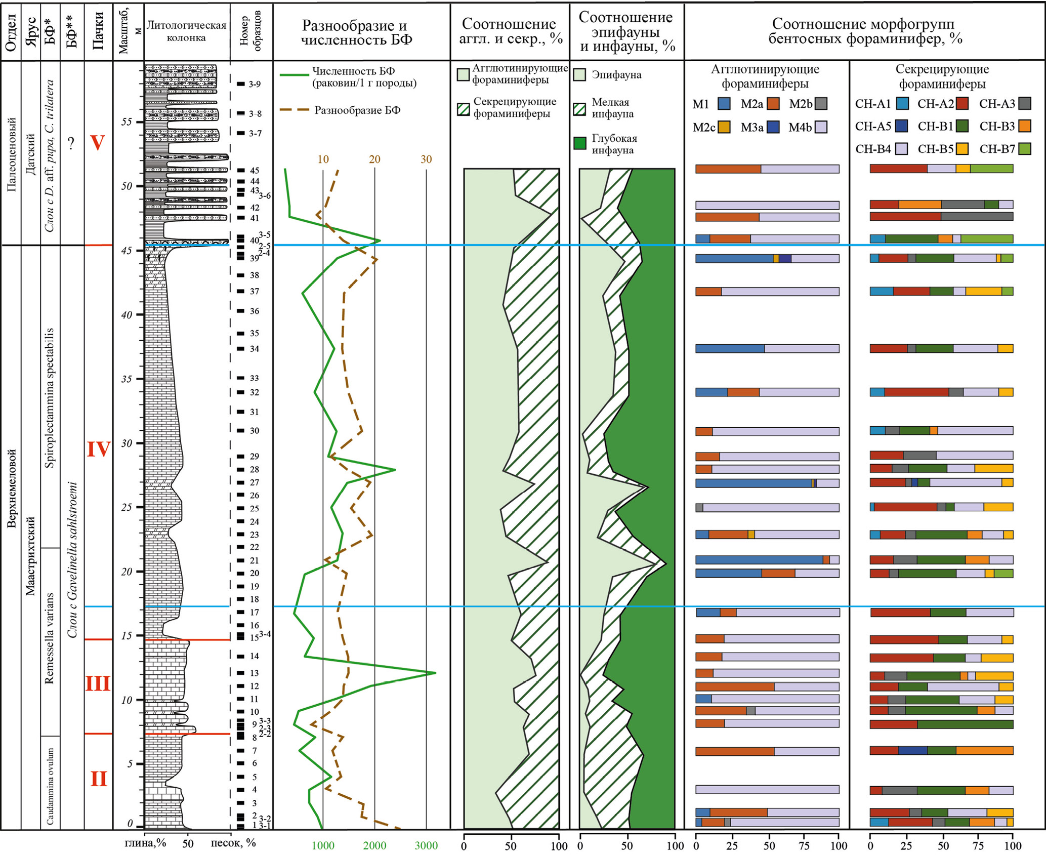 Третий этап (пачка V, обр. 40–45) соответствует нижнему данию, и выделен по наименьшему разнообразию и численности БФ. Следует отметить, что в обр. 40 численность БФ максимальна (1840 раковин/г). В обр. 41 доля агглютинирующих возрастает до 93% за счет глубокой инфауны морфогруппы M4b и мелкой инфауны M2a (Psammosphaera), последняя составляет до 29–45%. Среди секрецирующих в обр. 39 и 45 доминируют представители морфотипа CH-B7 (инфаунный Osangularia, до 37%), а в обр. 41 и 42 – CH-A3 (эпифауна/мелкая инфауна, до 14%).