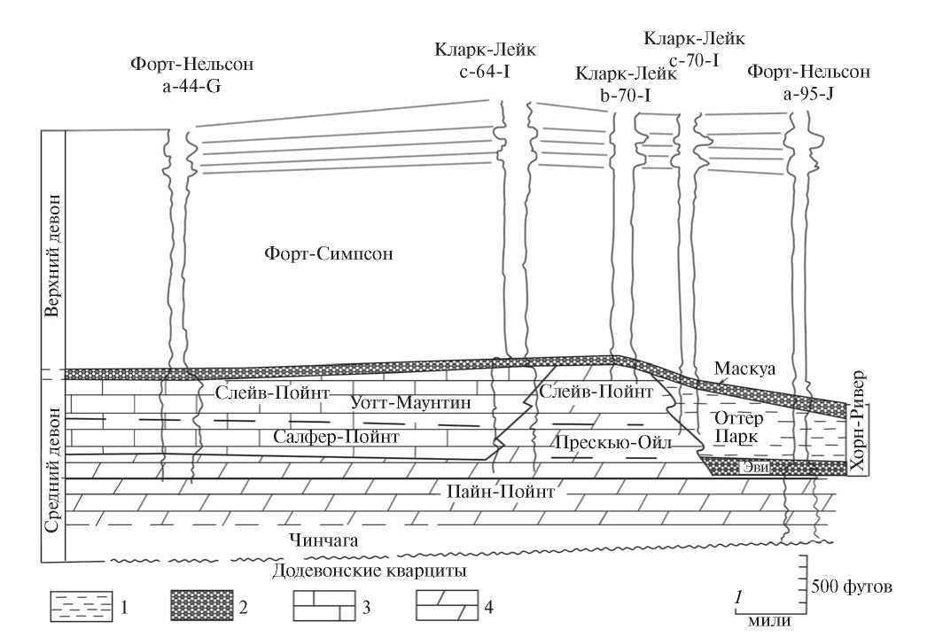 Рис. 1. Профильный разрез среднедевонских отложений краевого рифа Кларк-Лейк через лагунную зону, барьерный риф и сланцевый бассейн. Девон Западной Канады [Gray, Kassube, 1963]. 1 – темно-серые сланцы; 2 – битуминозные сланцы; 3 – известняки; 4 – доломиты.