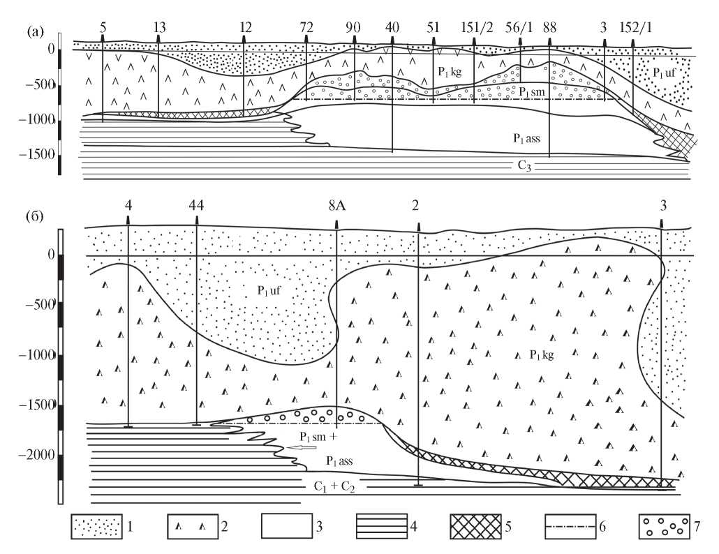 Рис. 3. Основные типы рифов Предуральского краевого прогиба ([Габдрахманов, 1966] с изменениями). а – Ишимбайский массив – пример куполовидного сакмаро-артинского рифа, б – Кунакбаевский массив – пример рифа асимметричной рифовой системы. 1 – пески, алевролиты, глины; 2 – гипсы, ангидриты, соли, мергели; 3 – отложения рифовых фаций (известняки органогенные, органогенно-обломочные, массивные); 4 – мелководно-морские отложения; 5 – отложения депрессионных фаций (известняки и мергели слоистые); 6 – водонефтяной контакт (ВНК); 7 – возможное наиболее низкое положение ВНК.