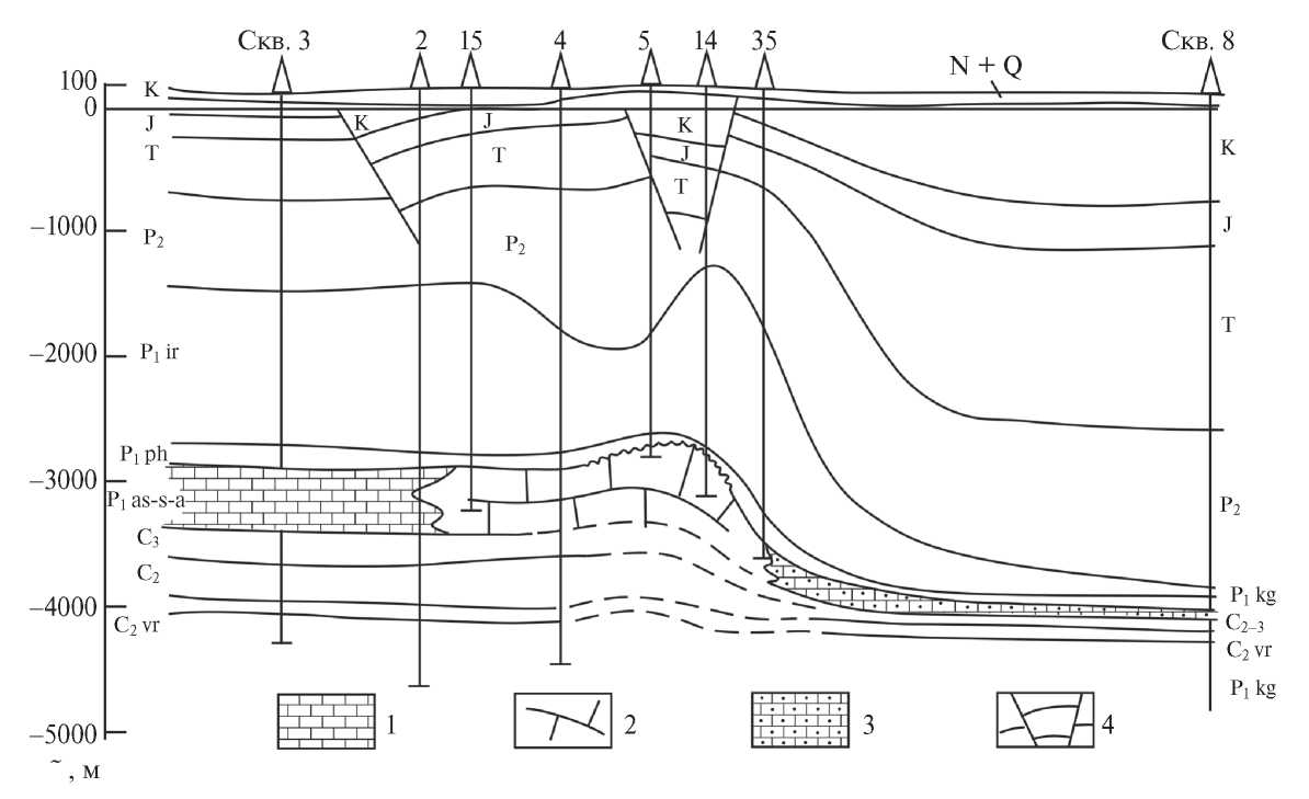 Рис. 4. Геологический профиль Западно-Тепловского рифа северной бортовой зоны Прикаспийской впадины ([Альжанов и др., 1975] с изменением). 1 – зарифовые мелководно-морские известняки и доломиты; 2 – рифовый комплекс; 3 – предрифовые относительно глубоководные карбонатно-глинистые отложения; 4 – зона грабенов.