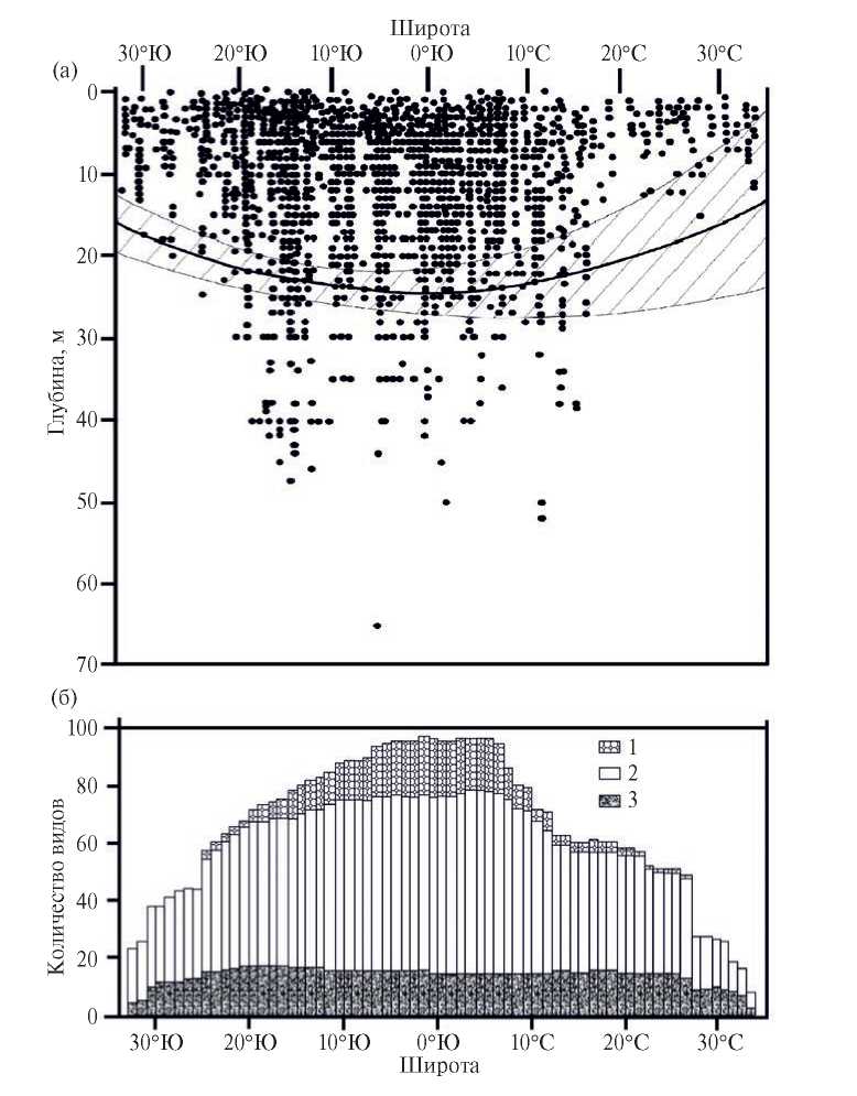 Рис. 8. Широтное распространение рифов в современных океанах [Muir et al., 2015]. а – общее распределение рифов; б – широтное распределение видов на разных глубинах: 1 – больших, 2 – средних, 3 – малых; наиболее распространены виды на малых глубинах.