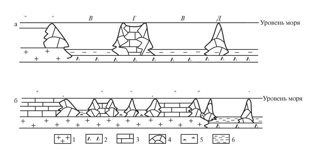 Рис. 9. Схема палеогеографического положения рифов кайнозоя (а) и палеозоя (б). 1– фундамент платформ; 2 – фундамент океанов; 3 – мелководные карбонатные отложения; 4 – рифы; 5 – относительно глубоководные отложения платформ; 6 – глубоководные отложения океанов. А – континентальная окраина с береговыми рифами; Б – барьерные океанические рифы; В – глубоководная зона океанов; Г – изолированные отмели с рифовым обрамлением; Д – одиночные внутриокеанические рифы, в том числе, атоллы; Е – мелководные карбонатные отложения шельфов и платформенных морей; Ж – краевые рифовые системы; З – отмели среди внутриплатформенных относительно глубоководных впадин с рифовым обрамлением; И – одиночные рифы внутриплатформенных впадин; К – краевые рифы на границах платформ; Л – внутриокеанические рифы.