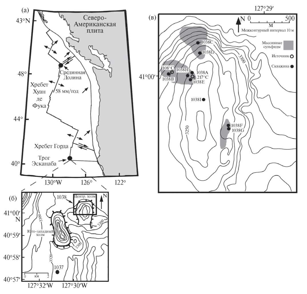 Рис. 1. Тектоническая схема северо-восточной части Тихого океана [Davis et al., 1992] (а), с указанием местоположения Центрального Холма и скважин 1037, 1038 в троге Эсканаба хребта Горда [Fouquet et al., 1998] (б), а также положения глубоководных скважин относительно гидротермальных источников на Центральном Холме [Fouquet et al., 1998] (в).