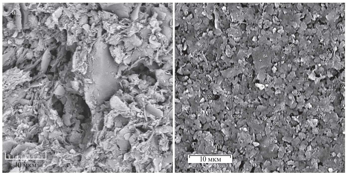 Рис. 3. Микрофотографии (СЭМ) терригенного алеврита (обр. 2271, скв. 1037В). а – свежий скол образца, б – фракция <0.001 мм (ориентированный препарат), цифры – номера спектров.