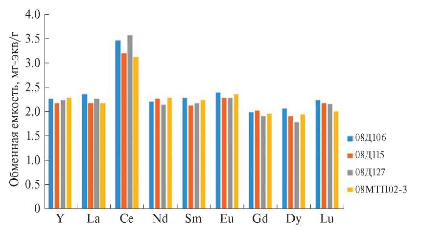 Рис. 1. Обменная емкость рудных минералов корок гайота Говорова по катионам редкоземельных металлов.