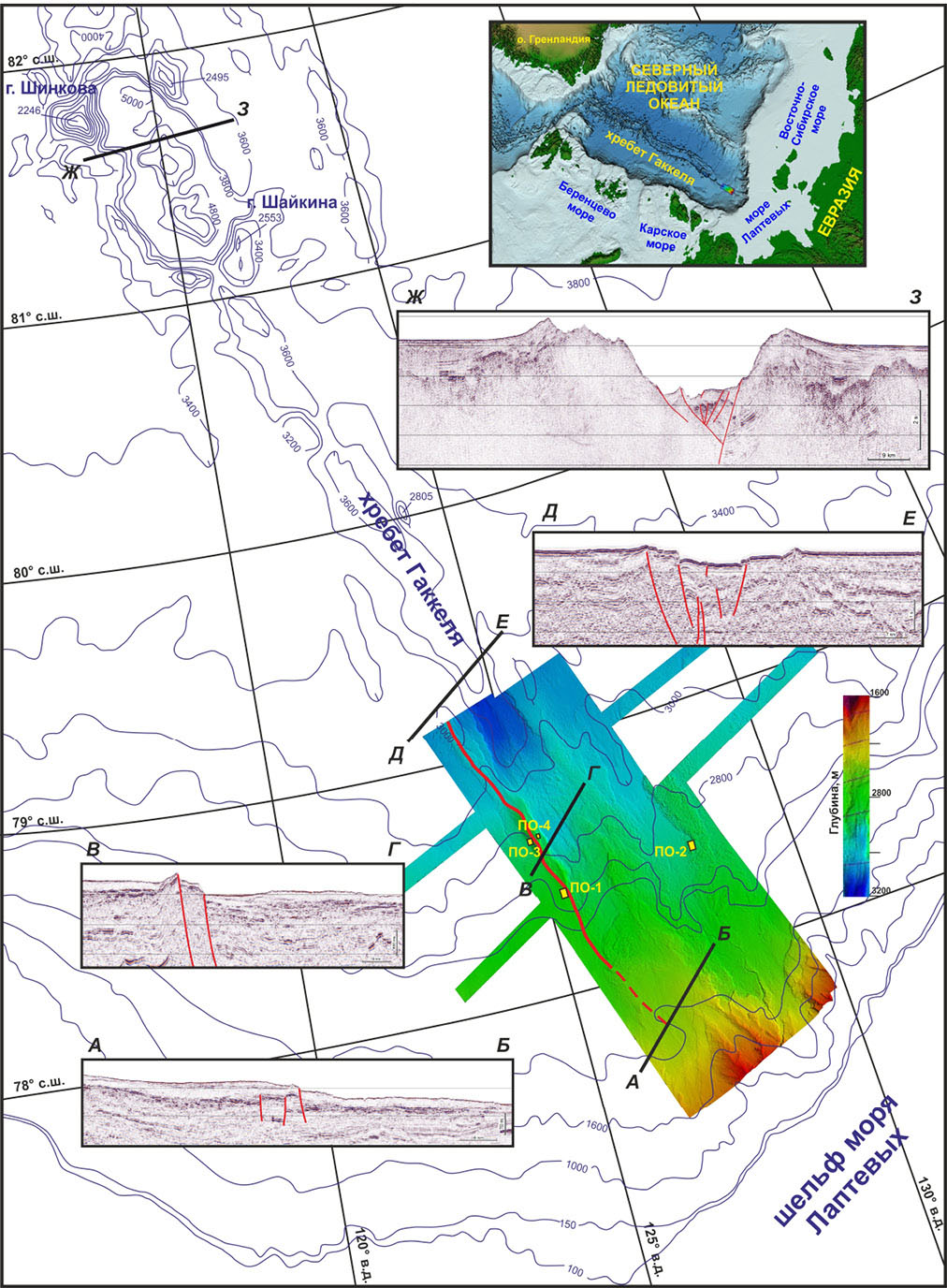 Рис. 2. Положение участка работ относительно главных структур Лаптевоморского фланга хребта Гаккеля. Красные линии – разломы; ПО – полигоны опробования; А–З – линии профилей и фрагменты сейсмических разрезов МОГТ: А–Б – SMNG 18-14, В–Г – SMNG 18-20, Д–Е – MAGE 90700, Ж–З – ARC 14-05. На врезке вверху – положение хребта Гаккеля и участка работ в структуре дна Северного Ледовитого океана.