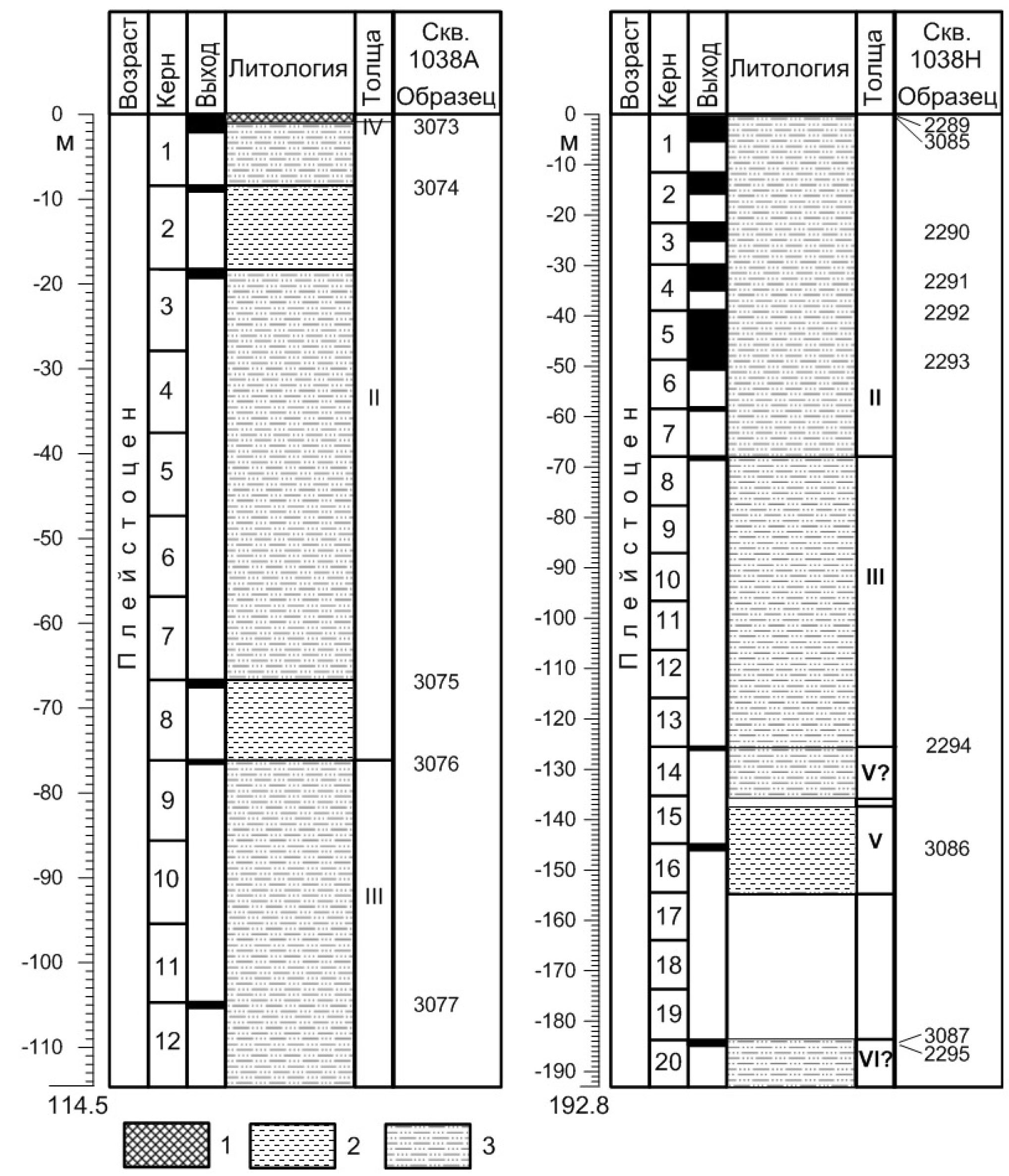 Рис. 1. Колонки скважин 1038А и 1038Н с привязкой образцов. 1 – массивные сульфиды, 2 – глины и глинистые осадки, 3 – тонко-среднезернистые турбидиты (пески и алевриты), переслаивающиеся с гемипелагическими осадками. Нумерация Толщ – по [Fouquet et al., 1998].
