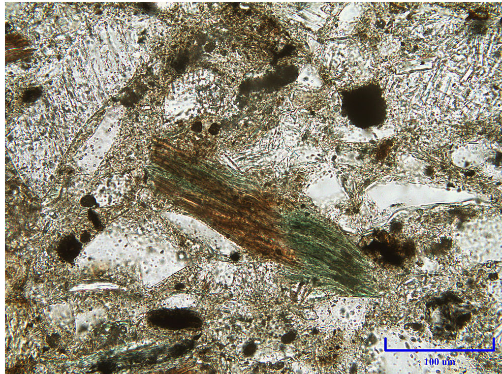 Рис. 2. Биотит практически полностью хлоритизированный (образец 3076, скважина 1038А), петрографический шлиф (николи параллельны).