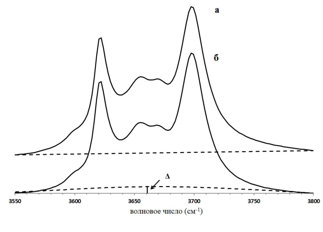 Рис. 2. Пример определения линии фона (пунктирные линии) для фрагмента ИК-спектра каолинита в области валентных колебаний ОН-групп. а – исходный фрагмент ИК-спектра; б – фрагмент ИК-спектра после вычитания из него прямой линии фона.