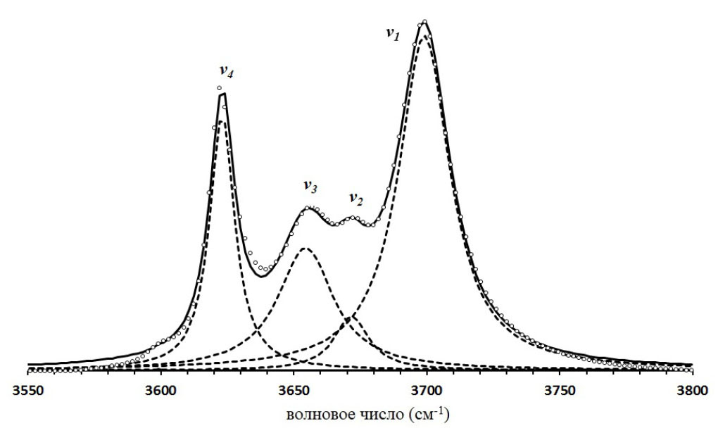 Рис. 4. Пример разложения фрагмента ИК-спектра каолинита (образец Mag1) в области валентных колебаний ОН-групп на индивидуальные лоренцовские пики. Светлые кружки соответствуют фрагменту экспериментального ИК-спектра, исправленного на линию фона с превышением Δ = 0.10. Пунктирные линии соответствуют индивидуальным пикам полос поглощения ν₁,v₂ ,ν₃ и ν₄. Сплошная линия соответствуют результирующей сумме индивидуальных пиков полос поглощения.
