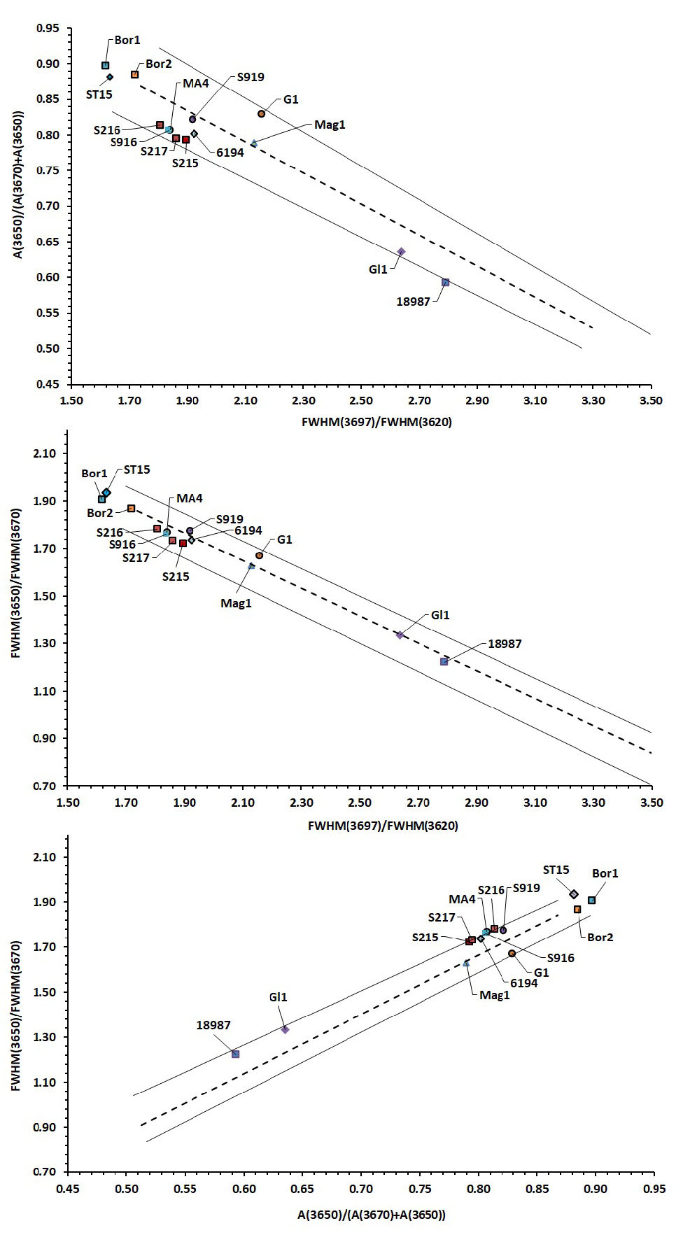 Поскольку [Drits et al., 2021] установили линейные зависимости (уравнения 1, 2, 3) между величинами HOK, полученными из рентгеновских данных, и отношениями спектроскопических параметров, , то должны существовать линейные зависимости и между самими этими отношениями. Подставив выражение для HOK вначале из третьего уравнения в первое, затем из второго уравнения в первое, и далее из второго уравнения в третье, получим три новых уравнения, которые связывают теперь друг с другом только отношения спектроскопических параметров:
