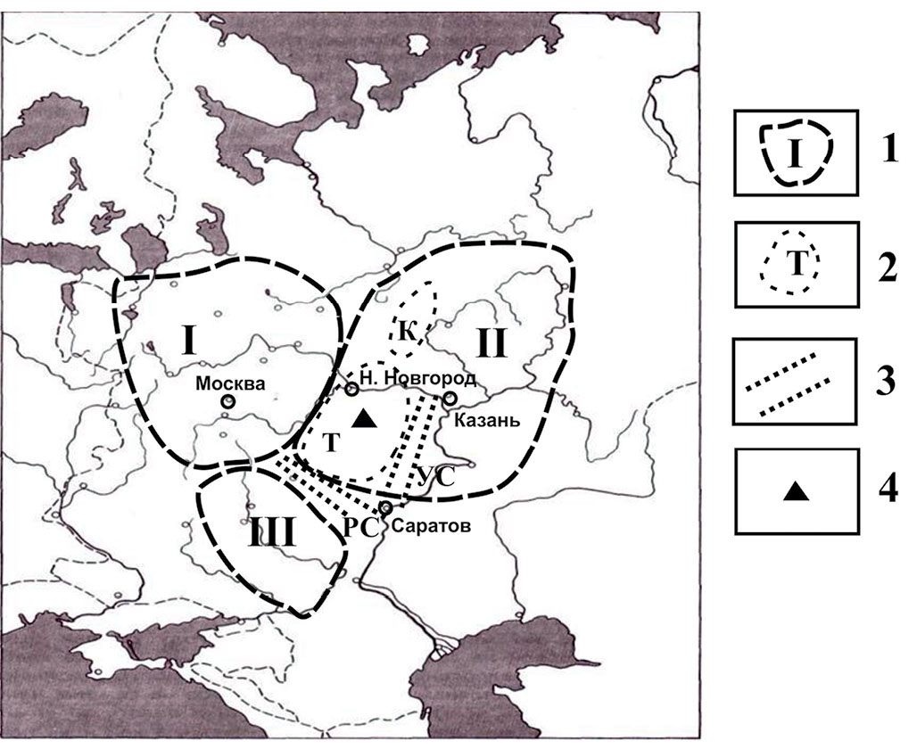 1 – структуры первого порядка: I – Московская синеклиза, II – Волго-Уральская антеклиза, III – Воронежская антеклиза; 2, 3 – структуры второго порядка (2 – своды: Т – Токмовский свод, К – Котельнический свод; 3 – прогибы: РС – Рязанско-Саратовский, УС – Ульяновско-Саратовский прогиб); 4 – Лукояновский редкометалльно-титановый россыпной район.