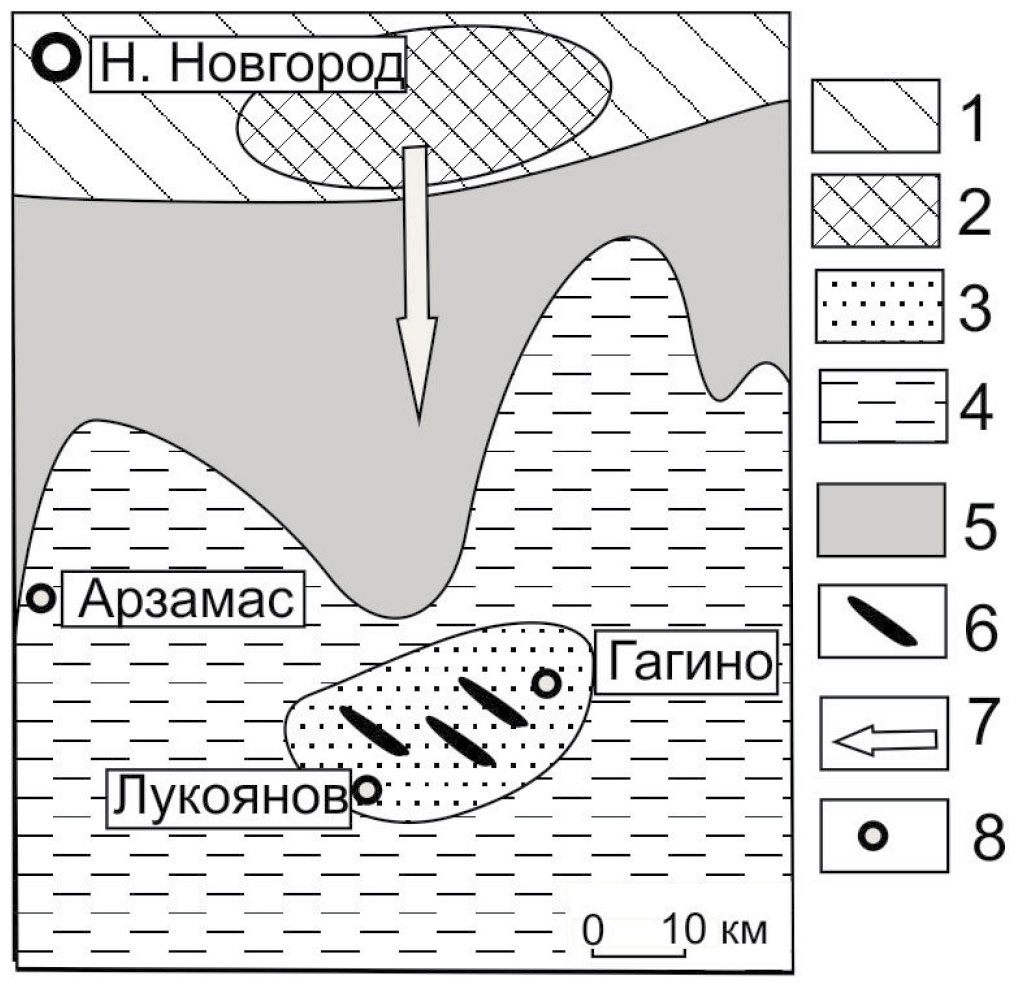 1 – область сноса, низкая суша; 2 – то же в области локальных поднятий (Воротниковский выступ); 3 – песчано-алевритовые отложения мелководья, банок и островов; 4 – алевро-пелитовые отложения; 5 – области где отложения юрского бассейна были эродированы в послемезозойское время; 6 – россыпи; 7 – направления поступления материала с суши; 8 – населенные пункты.