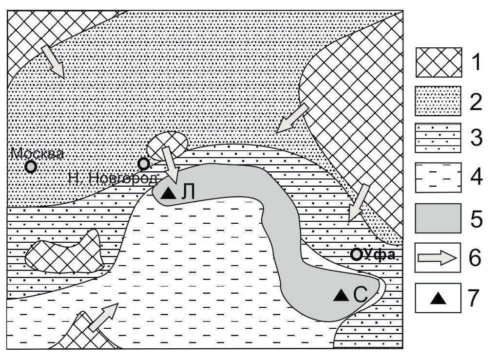 1 – горная и равнинная суша; 2 – равнинная суша, область осадконакопления; 3 – прибрежная равнина, временами заливаемая морем; 4 – мелководное море, терригенные осадки; 5 – площади развития перспективных продуктивных отложений; 6 – главные направления сноса обломочного материала; 7 – россыпные месторождения и проявления хромитов: Л – Лукояновский россыпной район, С – Сабантуйское проявление хромитов в пермских отложениях [Рахимов и др., 2020].