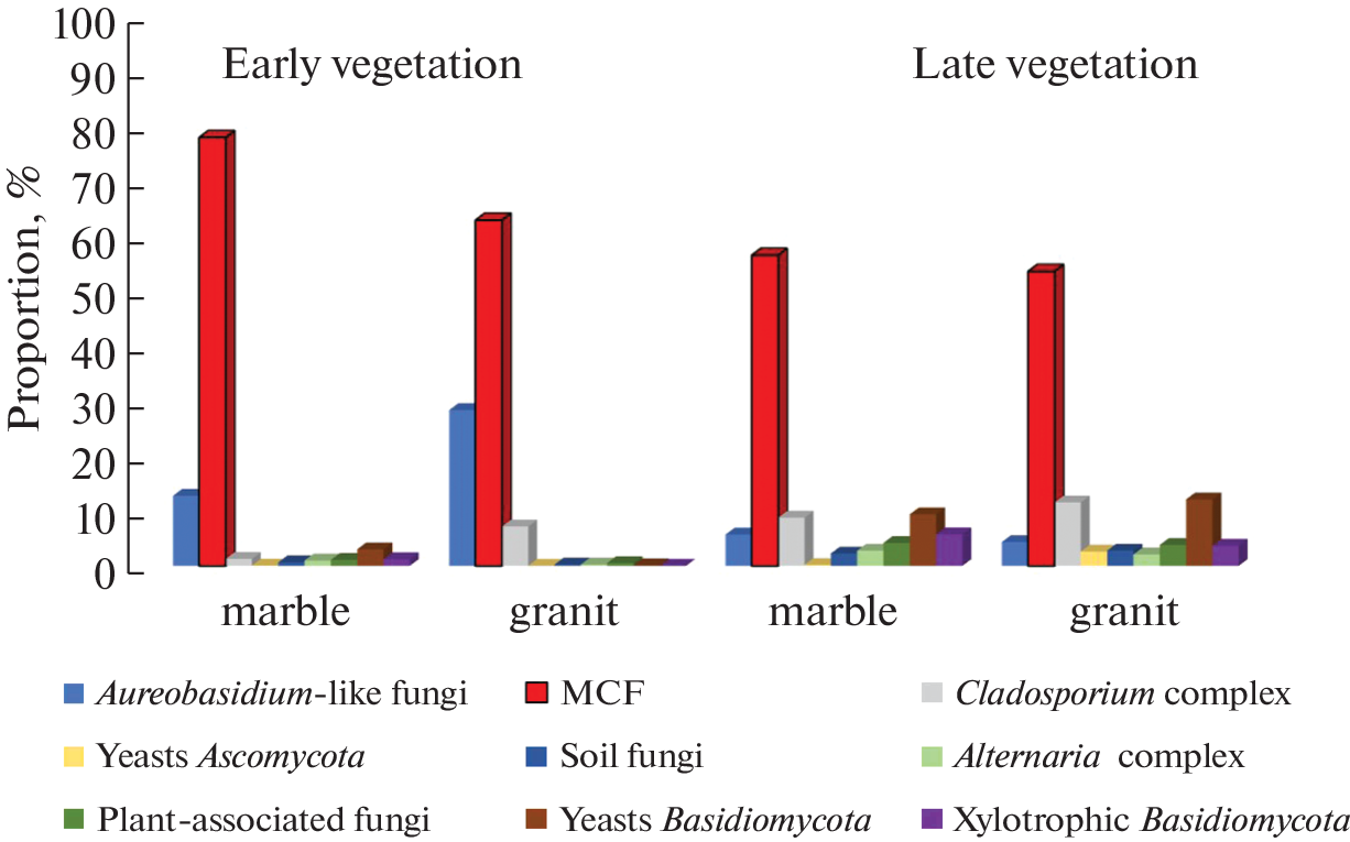 Fungi play an important role in colonization and biodeterioration of stone monuments in the open air. This study significantly complements the data on fungal diversity in lithobiotic communities through the use of metagenomic analysis. It was shown that the mycobiota of tombstones in the historical center of St. Petersburg has a complex structure. There are different complexes of species, which have various origins and ways of getting to the monuments. The complex of dominant fungi in SABs on marble and granite in St. Petersburg is formed by dark-colored micromycetes. At the species level, the absolute dominant in all samples was the Knufia karalitana according to metagenomic data and Aureobasidium pullulans according to cultural data. The use of two methodological approaches indicates the expediency of combining culture-based and molecular genetics methods, which make it possible to obtain the most more complete picture of the formation of lithobiotic communities. The season and the type of biofilm have a key importance for the abundance and diversity of micromycetes on stone surface. It was shown that type of rock has a minimal importance for the fungal diversity on stone monument.