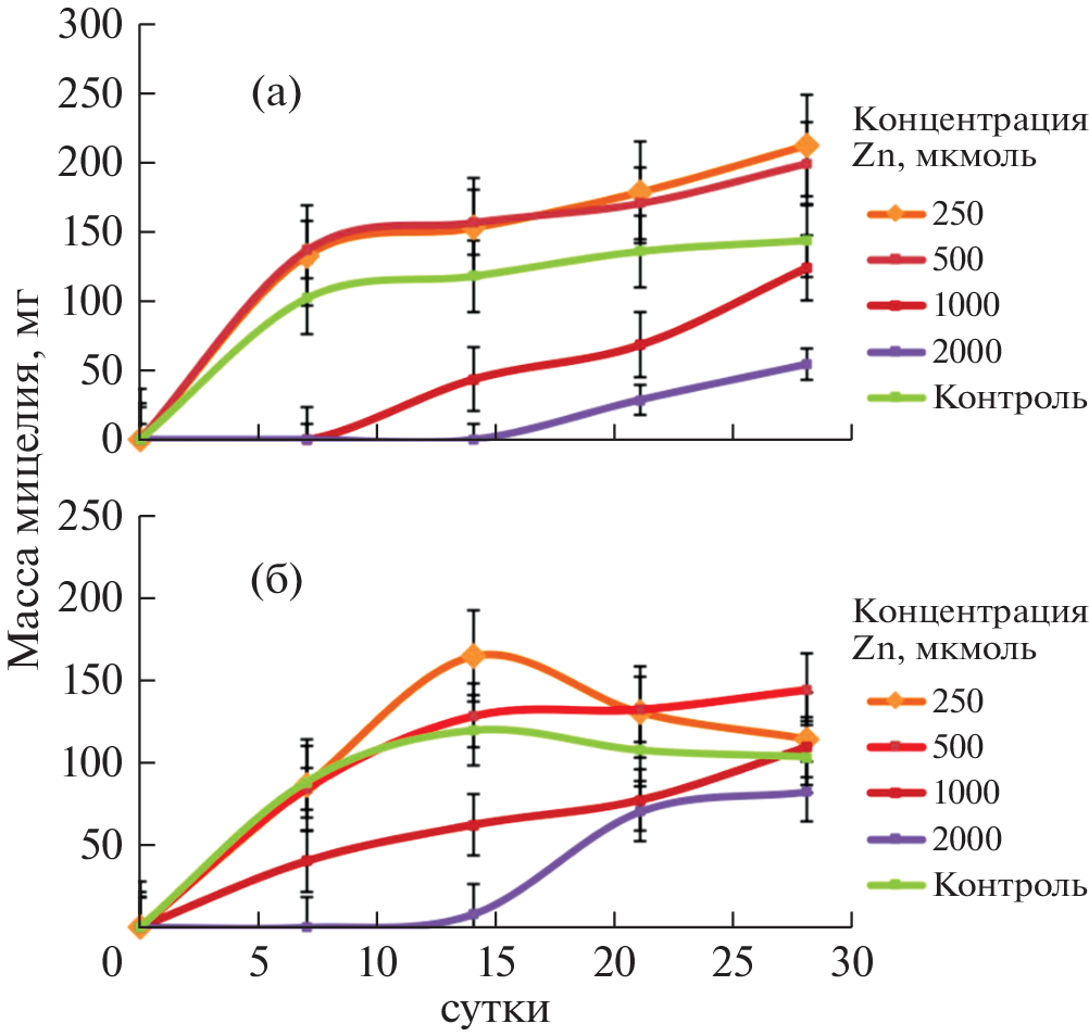 Microfungi are promising objects for bioremediation due to their ability to convert metals into forms that are less mobile and accessible to organisms. The study showed that the fungi Penicillium chrysogenum and Aspergillus niger have physiological mechanisms of extracellular Zn detoxification at its initial concentration of 250 µmol – 2 mmol in the medium. At concentrations of 250–500 µmol Zn promotes the accumulation of biomass and abundant sporulation of A. niger and Penicillium chrysogenum, and at concentrations of 1–2 mmol inhibits the growth of fungi. Extracellular Zn detoxification in Aspergillus niger culture occurs by the formation of dihydrate zinc oxalate katsarosite, due to the active biosynthesis of oxalic acid in A. niger. The main mechanism of zinc detoxification in Penicillium chrysogenum culture was the formation of zinc phosphate hopeite. The formation of zinc phosphate hopeite under the action of the fungus was established for the first time. The key factors that determine the direction of the processes of formation of extracellular mineral phases are the amounts of EPS and oxalic acid produced by fungi, as well as changes in the pH of the medium during the growth of cultures.