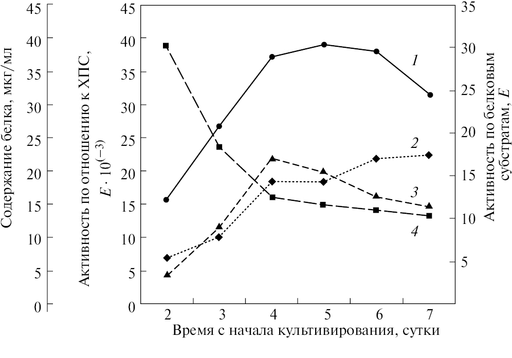 Рис. 1. Динамика накопления протеаз в культуральной жидкости при росте Aspergillus tabacinus на ферментационной среде 1 : 1 – активность по субстрату S-2366; 2 – концентрация белка; 3 – активность по субстрату Chromozym TH; 4 – азоказеинолитическая активность.