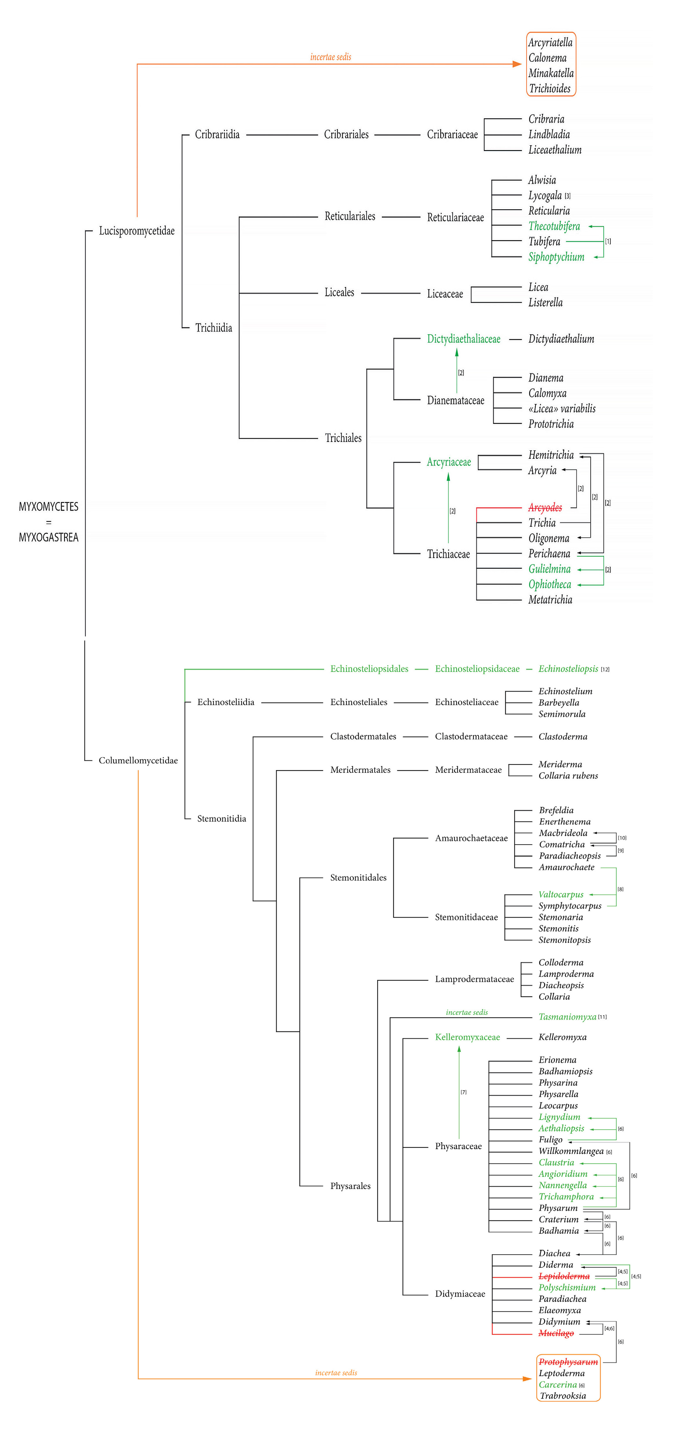 Рис. 1. Современное состояние системы миксомицетов (Myxomycetes) в соответствии с работой Leontyev et al., 2019a (с изменениями): [1] – Leontyev et al. (2019b); [2] – García-Cunchillos et al. (2022); [3] – объем рода был значительно расширен, см. Leontyev et al. (2022a, 2022 b, 2023, Leontyev, Schnittler, 2023); [4] – Prikhodko et al. (2023a); [5] – Ronikier et al. (2022); [6] – García-Martin et al. (2023); [7] – Erastova et al. (2013), Prikhodko et al. (2023b); [8] – Gmoshinskiy et al. (2023b); [9] – Moreno et al. (2023a); [10] – Moreno et al. (2023b); [11] – Lloyd et al. (2023); [12] – Wijayawardene et al. (2020). Черным цветом отмечены таксоны, которые признавались в момент написания и признаются в настоящее время. Зачеркнутые названия красного цвета соответствуют родам, которые были расформированы после публикации обзора Д.В. Леонтьева и соавт. (Leontyev et al., 2019a). Зеленым цветом отмечены восстановленные или впервые описанные таксоны. Направление стрелок означает перенесение видов из одного рода в другой