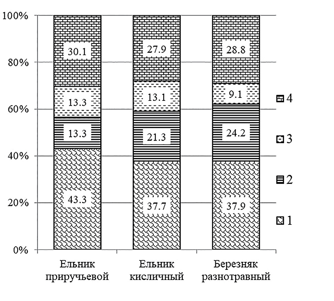 По периодам наблюдений в исследуемых биогеоценозах выявлялось от 32 (березняк разнотравный) до 64 (ельник приручьевой) видов высших сосудистых растений. Их видовой состав со временем оставался относительно стабильным (J = 56–88). Состав древостоя в исследуемых сообществах не изменялся. Во всех биогеоценозах в кустарничково-травяном ярусе происходили некоторые изменения по периодам наблюдений. Так, проективное покрытие кустарничково-травяного яруса ко II периоду во всех ценозах увеличилось почти в два раза и осталось таким же в третий период наблюдений.