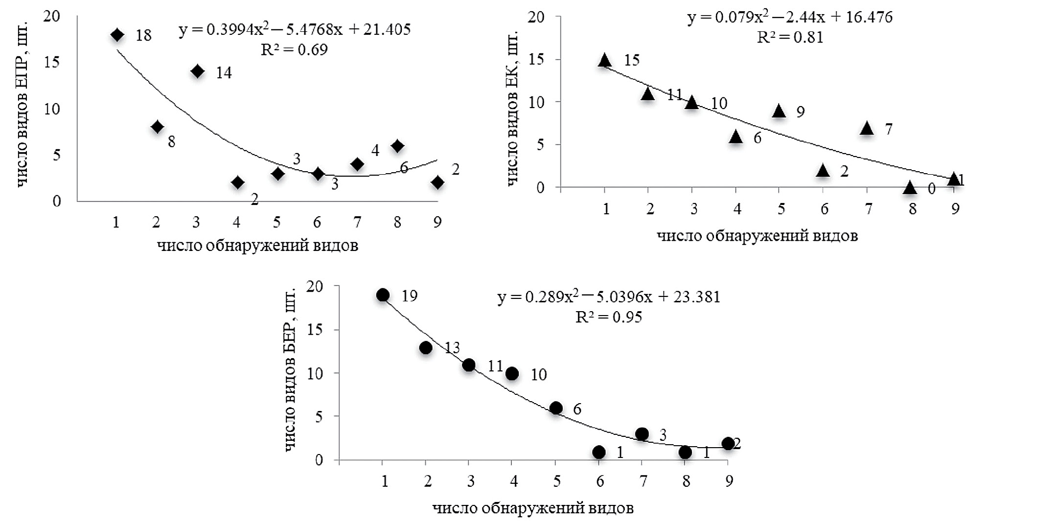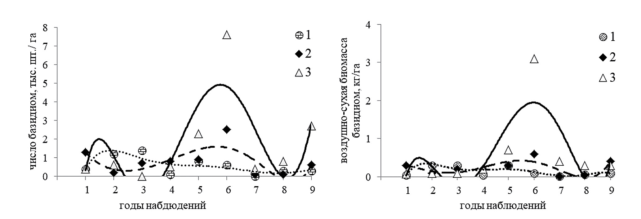 В качестве характеристик биоты ксилотрофных агарикоидных грибов взяты: 1) число видов за август – сентябрь, а также по декадам августа; 2) число и биомасса базидиом грибов (за август в целом, а также по декадам августа).