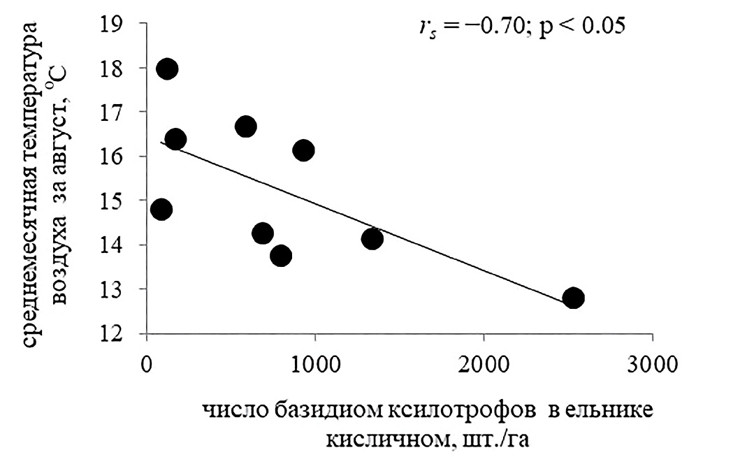 - Статистическая обработка данных. Влияние некоторых метеорологических показателей (по данным метеостанции г. Добрянка) на биоту ксилотрофных агарикомицетов изучалось с помощью корреляционного анализа. В качестве климатических показателей взяты: 1) средняя месячная температура воздуха с мая по сентябрь (°C); 2) сумма осадков (мм) по месяцам с мая по сентябрь; 3) сумма осадков за май–сентябрь (мм); 4) сумма осадков (мм) и средняя температура воздуха (°C) по декадам августа.