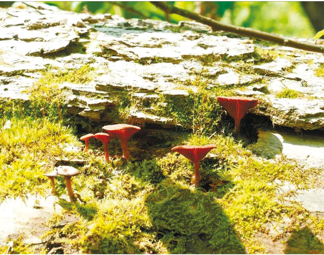 Рис. 1. Плодоношение Arrhenia discorosea на валежном стволе Ulmus sp., лиственный долинный лес. Национальный парк “Удэгейская легенда”, 21.05.2024 (фото Е. А. Ерофеевой).