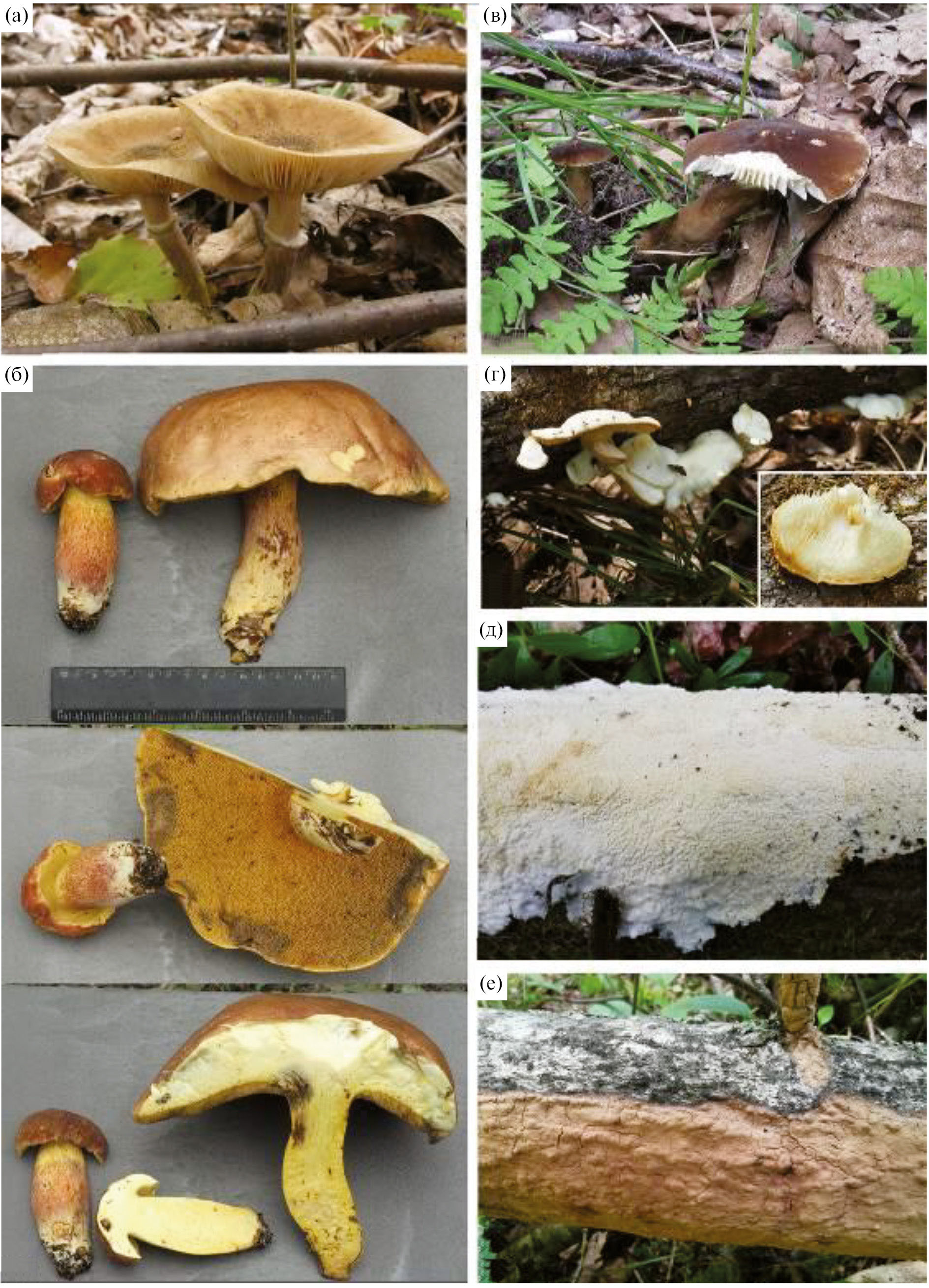 Рис. 1. Базидиомицеты заповедника “Бастак”: а – Armillaria cepistipes (VLA M-24748); б – Baorangia alexandri (VLA M-28065); в – Lactarius fuliginosus (VLA M-24752); г – Mycoleptodonoides vassiljevae (наблюдение); д – Ceraceomyces borealis (VLA M-28349); е – Phlebiopsis pilatii (VLA M-28407).
