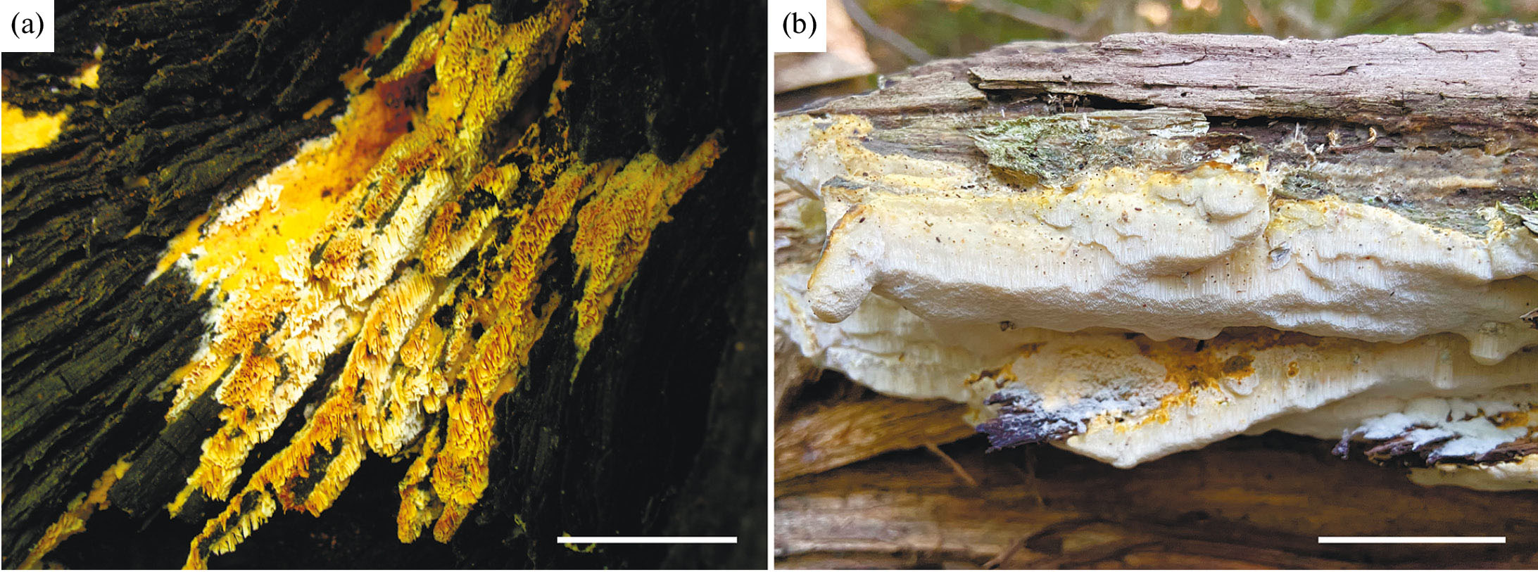 Fig. 1. Basidiomata of Riopa metamorphosa (a) and Yuchengia narymica (b), scale bar 1 cm.