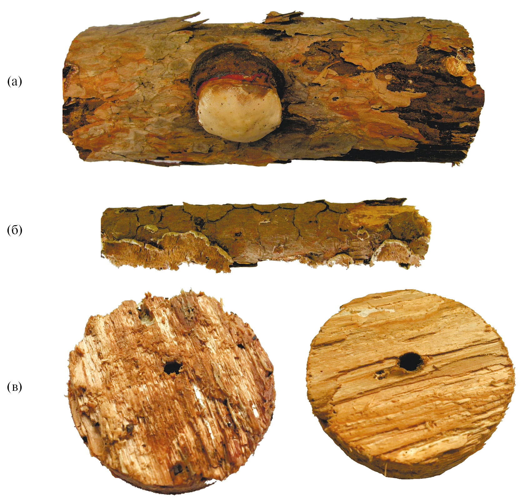Рис. 1. Образцы древесины Pinus sylvestris с базидиокарпами Fomitopsis pinicola (А) и Trichaptum fuscoviolaceum (Б); образцы древесины Picea obovata (В), подготовленные с помощью корончатого сверла, слева – разрушаемые Fomitopsis pinicola, справа – Gloeophyllum sepiarium.