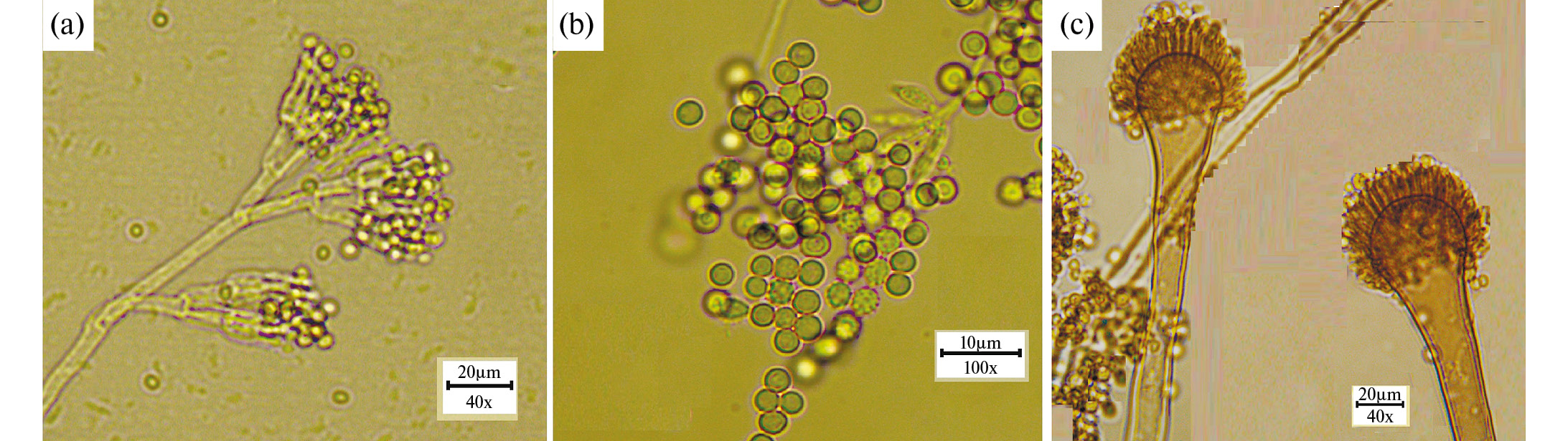Fig. 2. Main fungal species isolated: (a) Penicillium citrinum; (b) Microascus brevicaulis; (с) Aspergillus fumigatus