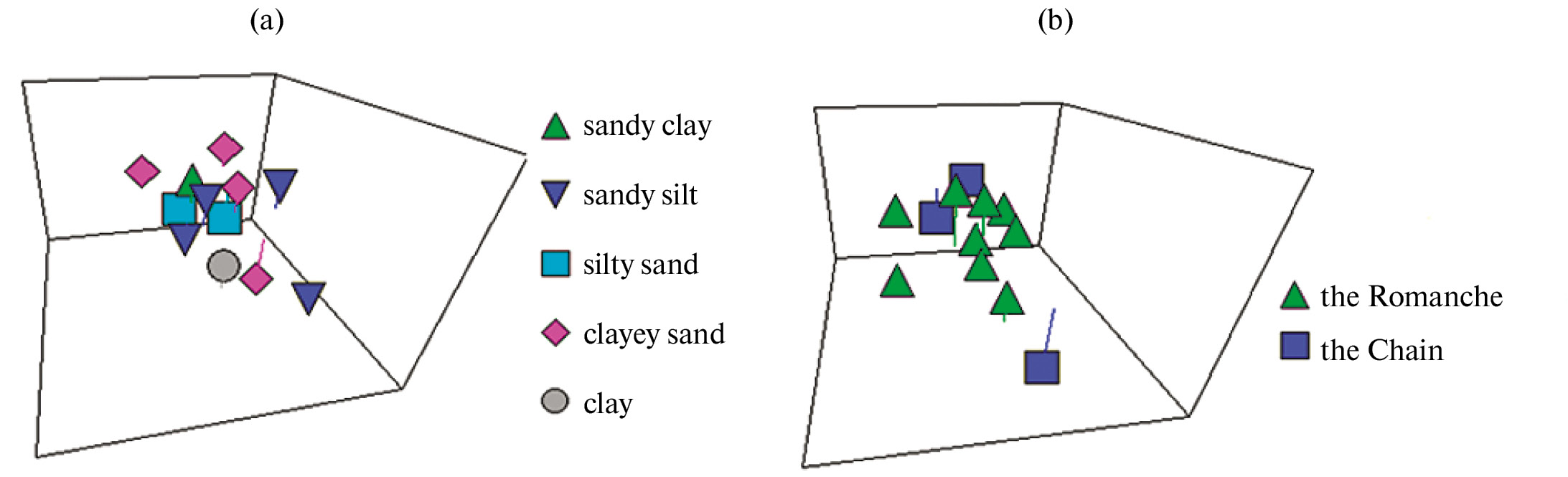 Fig. 3. MDS (3D) similarity of fungal communities: а – in sediments of different types; b – in sediments of the Romanche and Chain Fracture Zones (according to the Bray-Curtis similarity coefficient)