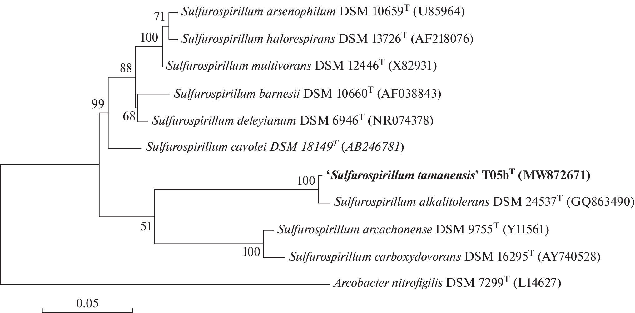 Abstract—An alkaliphilic, facultatively anaerobic bacterium (strain T05bT) was isolated from a terrestrial mud volcano on the Taman Peninsula, Russia. The cells of the isolate were motile spirilla 0.5 µm thick and 1.5–2.5 µm long. Strain T05bT grew at 6–42°C (optimum at 30°C), pH 8.0–11.0 (optimum at 9.0), and 0–14% NaCl (wt/vol). Lactate, formate, malate, pyruvate, H2, elemental sulfur, sulfite, thiosulfate, and sulfide were used as electron donors; nitrate, fumarate, elemental sulfur, sulfite, thiosulfate, dimethyl sulfoxide, arsenate, and oxygen could be used as electron acceptors. Nitrate was reduced to ammonium. Malate, pyruvate, and fumarate were fermented. Microaerobic growth was possible at up to 3% О2 (vol/vol). Strain T05bT did not use sulfate and Fe(III) as electron acceptors, was unable of elemental sulfur, sulfite, or thiosulfate disproportionation, and did not ferment glucose, fructose, sucrose, lactate, formate, maleate, yeast extract, or peptone. The predominant fatty acids were C16:1 ω7 (45.9%), C16:0 (25.8%), and C18:1 ω7 (20.9%). The genome of strain T05bT was 2.46 Mb in size and had the G + C DNA content of 45.5%. It contained the genes encoding the following enzymes of energy metabolism: Nap nitrate reductase periplasmic complex, Phs/Psr thiosulfate/polysulfide reductase, Sqr sulfide:quinone oxidoreductase, and Arr respiratory arsenate reductase. Ac-cording to analysis of the 16S rRNA gene nucleotide sequence, strain T05bT exhibited 98.61% similarity to the type strain of Sulfurospirillum alkalitolerans (phylum “Campylobacterota”). Based on its phenotypic characteristics and the results of phylogenetic analysis, assignment of the isolate to a new Sulfurospirillum species, Sulfurospirillum tamanensis sp. nov., is proposed, with the type strain T05bT (=DSM 112596T = VKM B-3538T).