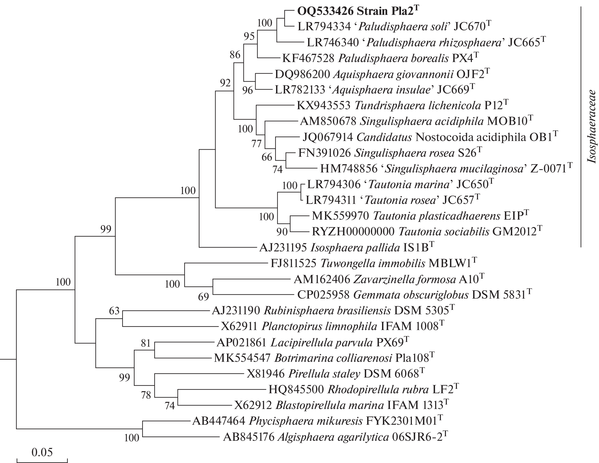 Abstract—Planctomycetes are common inhabitants of northern wetland ecosystems. In this study, a new planctomycete of the genus Paludisphaera, strain Pla2T, was isolated from a boreal fen in Russia. The novel isolate was represented by nonmotile, pink-pigmented, spherical cells that multiplied by budding and occurred singly or were assembled in small aggregates. Strain Pla2T was a chemoorganotrophic, psychrotolerant mesophile with a growth optimum at pH 5.5‒6 and 15‒20°C. The preferred growth substrates were polysaccharides, including xylan, xanthan gum, and phytagel, as well as some sugars. The 16S rRNA gene sequence of strain Pla2T displayed the highest similarity (97.9%) to that of ‘Paludisphaera soli’ JC670T isolated from highland soil of the western Himalayas. With other members of the genus Paludisphaera, “P. rhizosphaerae” JC665T and P. borealis PX4T, this similarity was 97.0 and 93.8%, respectively. The genome of strain Pla2T was 8.21 Mb in size and contained about 6500 protein-coding genes and 3 copies of the rRNA operon. The DNA G + C content was 67 mol %. The average nucleotide identity between the genome sequence of strain Pla2T and those of previously described members of the genus Paludisphaera was between 79.4 and 82.6%. This genotypic distance as well as several phenotypic differences allowed classifying the new planctomycete from a fen as representing a novel species of the genus Paludisphaera, Paludisphaera mucosa sp. nov. with the type strain Pla2T (=KCTC92668T = VKM B-3698T).