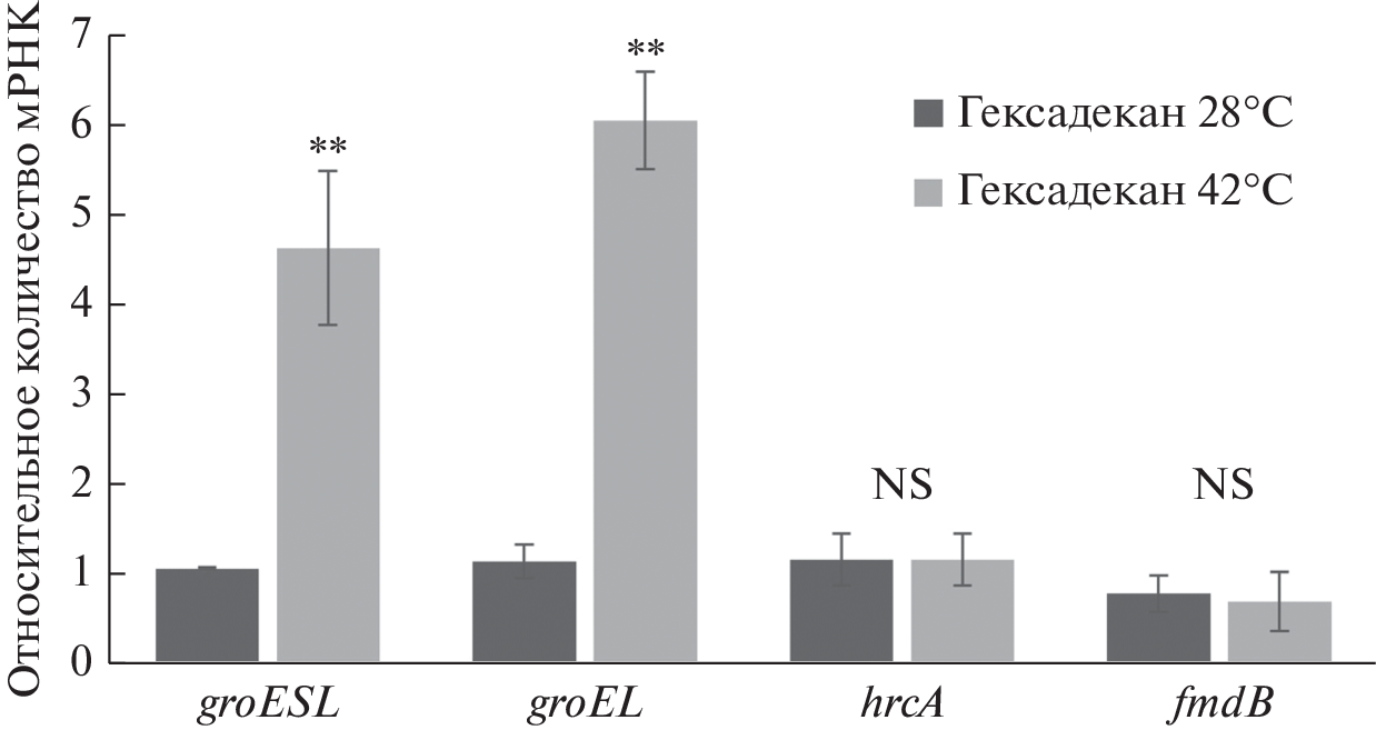 Abstract—The role of groESL and dnaJ structural genes and hrcA regulatory gene, encoding the synthesis of heat shock proteins, in biosurfactant synthesis by R. pyridinivorans 5Ар was determined. The CIRCE binding sites for the regulatory protein coded by hrcA gene were revealed in the promoter regions of groESL, groEL2, and fmdB genes. GroESL and groEL2 genes expression during the late exponential phase in the medium with hexadecane at 42°C was higher than at 28°C (4.4 and 5.3 times, respectively). At the same time, no changes in expression of hrcA and fmdB genes were observed at two different temperature modes (28 and 42°C). In the absence of the negative regulator HrcA, groESL expression increased 14.4 and 3.5 times, that of groEL2, 9.6 and 2.7 times, and that of fmdB, 1.82 and 2.52 times at 28 and 42°C, respectively. Products of dnaJ and hrcA genes were required for trehalolipid synthesis at different temperature modes, with their role increasing at higher temperature (synthesis of trehalolipids by the mutant with impaired dnaJ gene decreased 1.8 and 2.5 times compared to 1.5 and 6.6 times, for the mutant with impaired hrcA at 28 and 42°C, respectively). At the same time, emulsifying activity of all mutant variants did not change at 28°C and decreased 1.4 and 1.9 times 42°C for the mutants with impaired groESL and hrcA genes, respectively. Our results indicated the complex chemical nature of the biosurfactants produce by R. pyridinivorans 5Ар (emulsifiers, including trehalolipids and compounds of other chemical composition). The Gro chaperones and the HrcA regulatory protein play the key roles in synthesis of these compounds at different temperature modes, while the dnaJ is required only for trehalolipid synthesis.