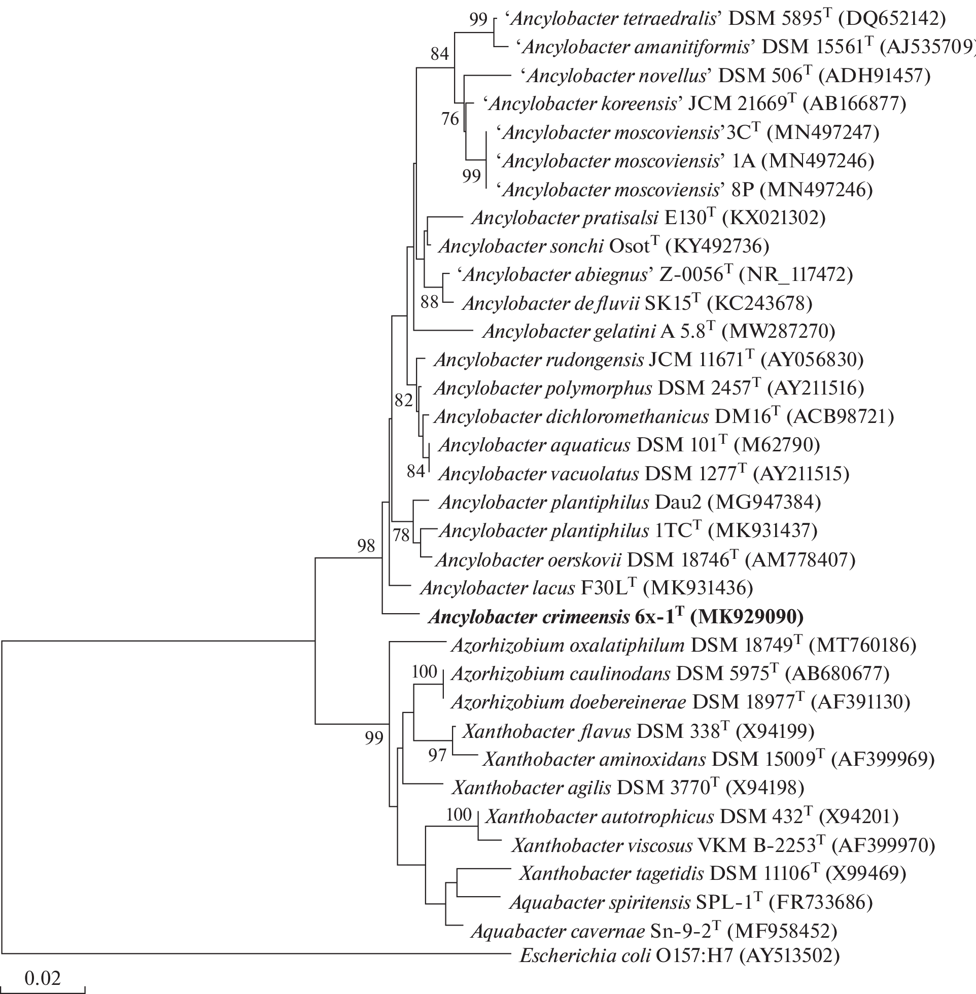 A new facultative methylotroph, strain 6x-1T, was isolated from the phyllosphere of oak (Quercus pubescens Willd.) on the medium with methanol. Cells were aerobic, gram-negative, not-spore-forming, non-motile short ovoids rods reproducing by binary fission. Growth optimum was at 25‒29°C and pH 7.0‒7.5; growth was inhibited by 1.5% NaCl. Predominant fatty acids were C18:1ω7c and C19:0cyclo. Predominant phospholipids were phosphatidylethanolamine, phosphatidylmonomethylethanolamine, and diphosphatidylglycerol. Tha major ubiquinone was Q10. The 16S rRNA gene sequence of strain 6x-1T exhibited the highest similarity to those of members of the genus Ancylobacter (97.0‒97.4%). Genome analysis of strain 6x-1T and most closely related Ancylobacter strains revealed that the values of ANI (80.7‒83.5%), dDDH (22.4‒23.3%), AAI (72.0‒78.0%), and POCP (62.0‒69.0%) were below the recommended threshold values for prokaryotic species. Genome size of strain 6x-1T was 4.29 × 106 Mb, and G + C content was 67.3%. According to the results of phylogenetic, phylogenomic, phenotypic, and chemotaxonomic analysis, strain 6x-1T (=VKM В-3256T = ССUG 72401T) represents a new species of genus Ancylobacter, for which the name Ancylobacter crimeensis sp. nov. is proposed.