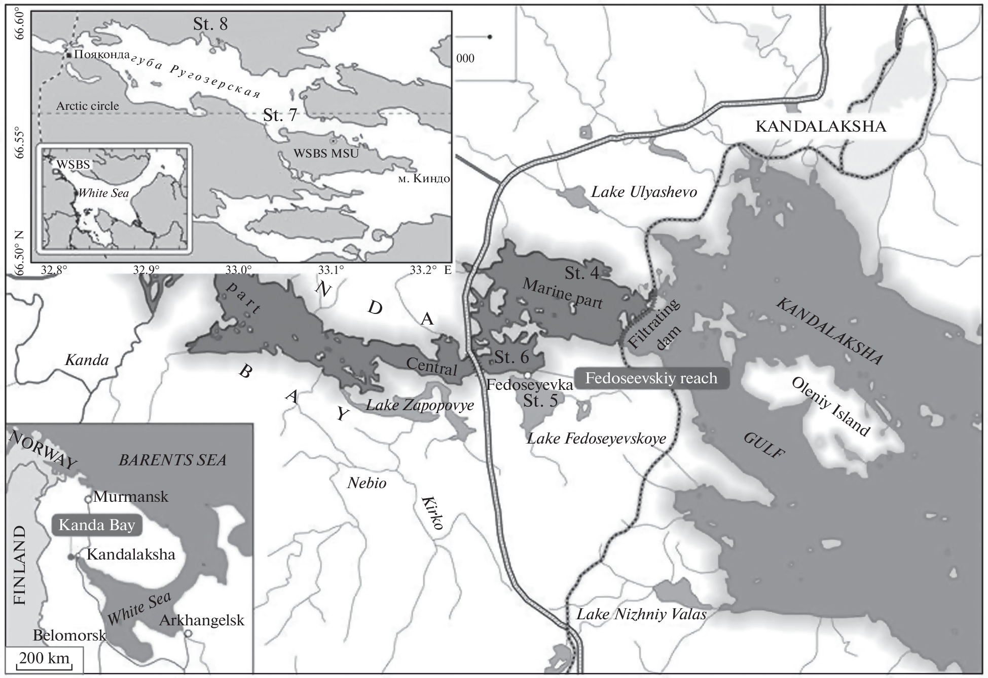 Залив (губа) Канда относится к водоемам, образовавшимся в результате строительства железнодорожной дамбы (1916 г.) и последовавшей изоляции морской лагуны от основного бассейна Кандалакшского залива Белого моря. В результате сокращения влияния приливо-отливных течений, перемешивающих водную толщу морской лагуны, изменился гидрологический режим водоема. Сокращение водообмена привело к появлению придонных застойных вод, лишенных кислорода, а также сероводородного заражения. При этом в южной части акватории залива Канда сохранилось пресное озеро. В различных акваториях залива Канда проведены исследования состава микробного сообщества придонного водного слоя. Показано, что в придонной воде залива Канда меняется кислородный режим, возрастает концентрация сероводорода и метана, активизируются процессы сульфатредукции и метанокисления. Заметно меняется состав микробного сообщества, уменьшается численность истинно морских и пресноводных микроорганизмов, развиваются бактерии и археи, доминирующие в микробных сообществах аноксийных вод меромиктических водоемов. Среди общего разнообразия микроорганизмов выявлены индикаторные виды, увеличивающие свое обилие. К таким видам относятся археи из родов Methanoregula и Methanosaeta (филум Halobacterota). Индикаторами застойных морских вод оказались микроорганизмы цикла серы. Это аноксигенные фототрофные бактерии класса Chlorobia (Chlorobium phaeovibrioides, Pelodictyon phaeoclathratiforme), это Chloroflexi рода Chloronema, несерные пурпурные бактерии, близкие к роду Rhodoferax, бесцветные серные бактерии семейства Beggiatoaceae, а также тионовые бактерии рода Thiobacillus. Археи рода Nitrosopumilus (филум Crenarchaeota), а также бактерии рода Woeseia могут считаться “анти-индикаторными” микроорганизмами, поскольку они обнаруживаются только в водах открытого моря. Мы полагаем, что при устойчивом обмене вод через морскую дамбу состав микробного сообщества вод залива Канда не будет существенно меняться и будет подвержен только сезонным и межгодовым колебаниям. При негативном развитии событий можно дать прогноз превращения залива Канда в стратифицированный водоем с аноксийным придонным водным слоем и сообществом микроорганизмов, сходным с меромиктическими водоемами.