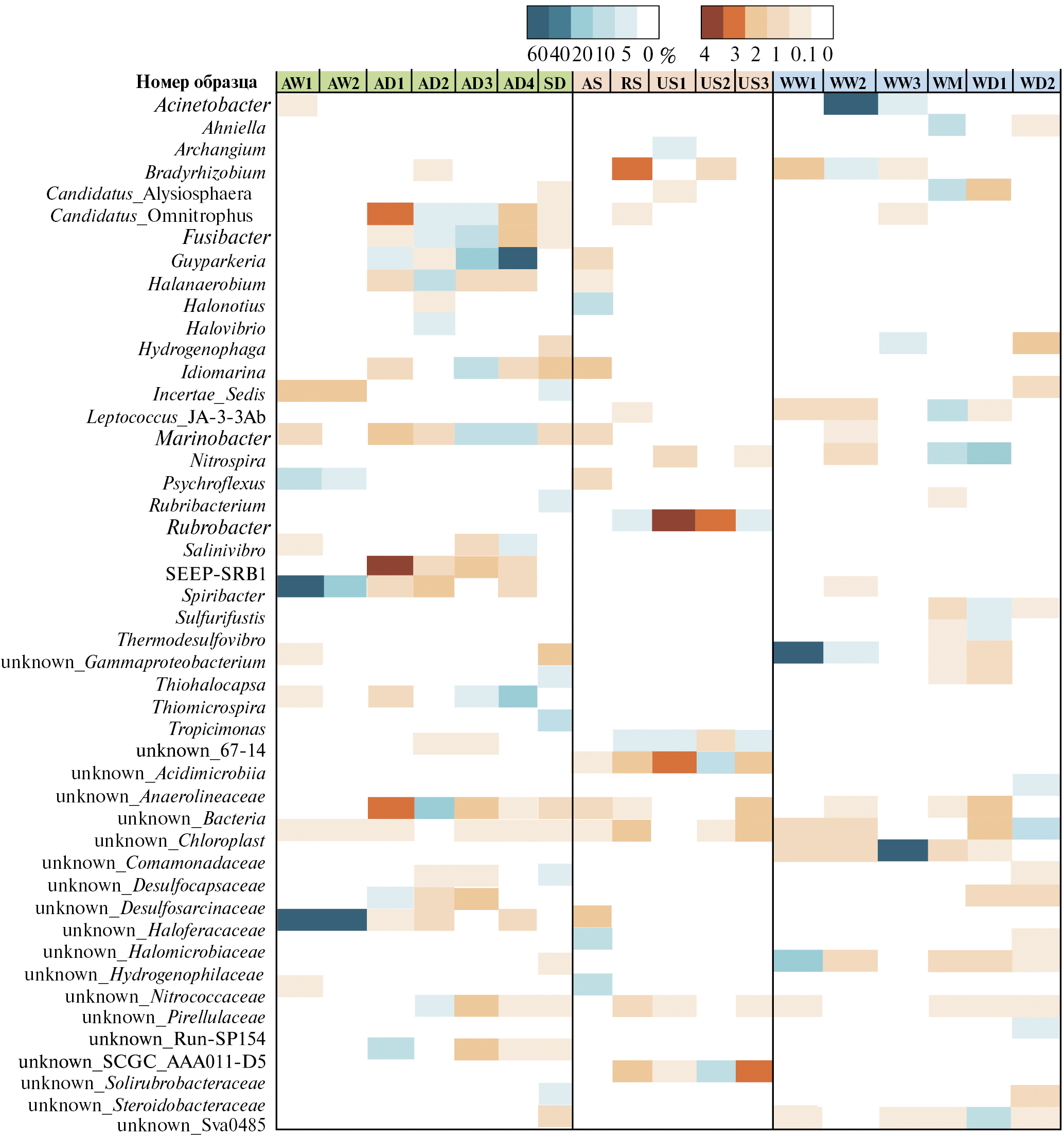 Рис. 3. Тепловая карта, отражающая численность представителей некоторых родов, составляющих более 5% всего сообщества (синий цвет). Коричневым цветом показаны те же представители в количестве менее 5%