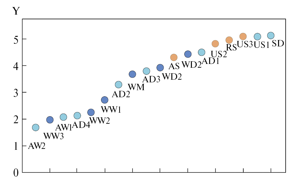 Рис. 4. Индекс разнообразия Шеннона (ось Y). Наименьшее разнообразие ASV филотипов наблюдается в образцах AW2, WW3, AW1, AD4 и WW2. Наибольшее разнообразие ASV филотипов выявлено в образцах ризосферы (RS), с плато Устюрт и из оз. Судочье (SD)