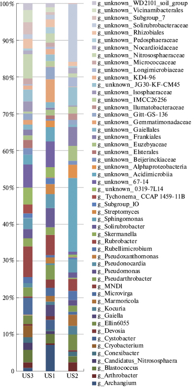 Рис. S3. Гистограмма, отражающая филогенетический состав (уровень рода) по результатам профилирования по гену 16S рРНК микробных сообществ, приуроченных к почвам плато Устюрт (US3, US1 и US2)
