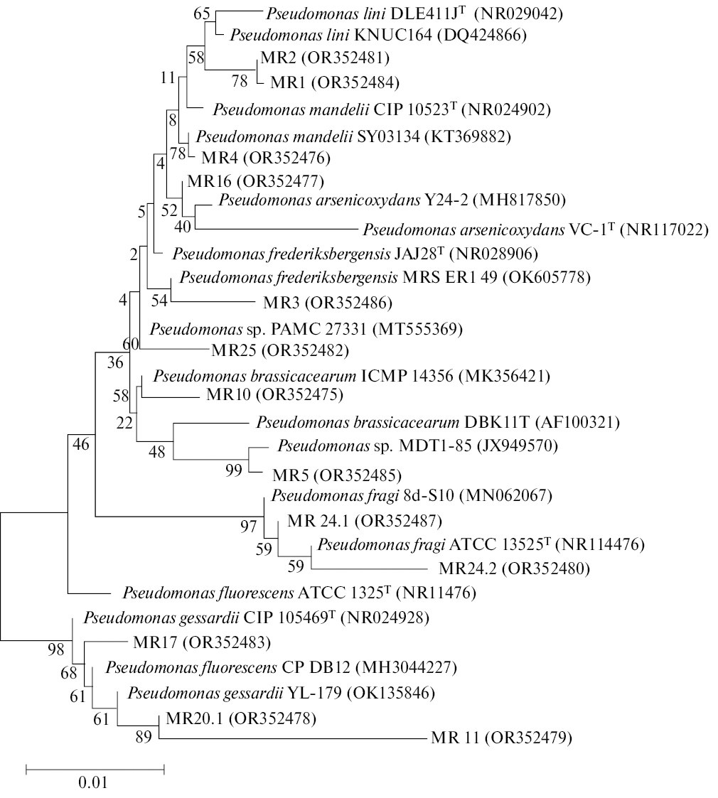 МР1 | OR352484 | 1100 | 99.64 | Pseudomonas lini KNUC164 (DQ424866) |