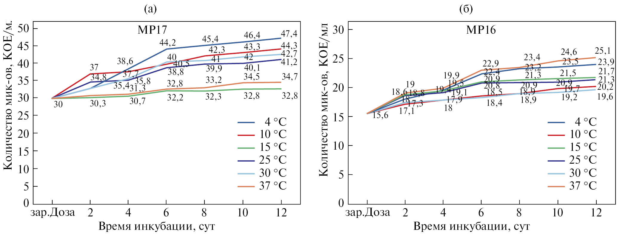 Одной из важнейших характеристик обитающих в пещере микроорганизмов является температурный диапазон роста. Температурный оптимум роста всех исследуемых бактерий находился в пределах 4–25℃. При 30 и 37℃ увеличение концентрации бактериальных клеток для большинства штаммов не наблюдали. Исключение составили штаммы МР16 и МР2, темпы роста которых заметно увеличивались при 37℃ на протяжении всего времени культивирования (рис. 3б). На рис. 3а представлены кривые роста штамма МР 17, демонстрирующие характер роста большинства штаммов при разных температурах.