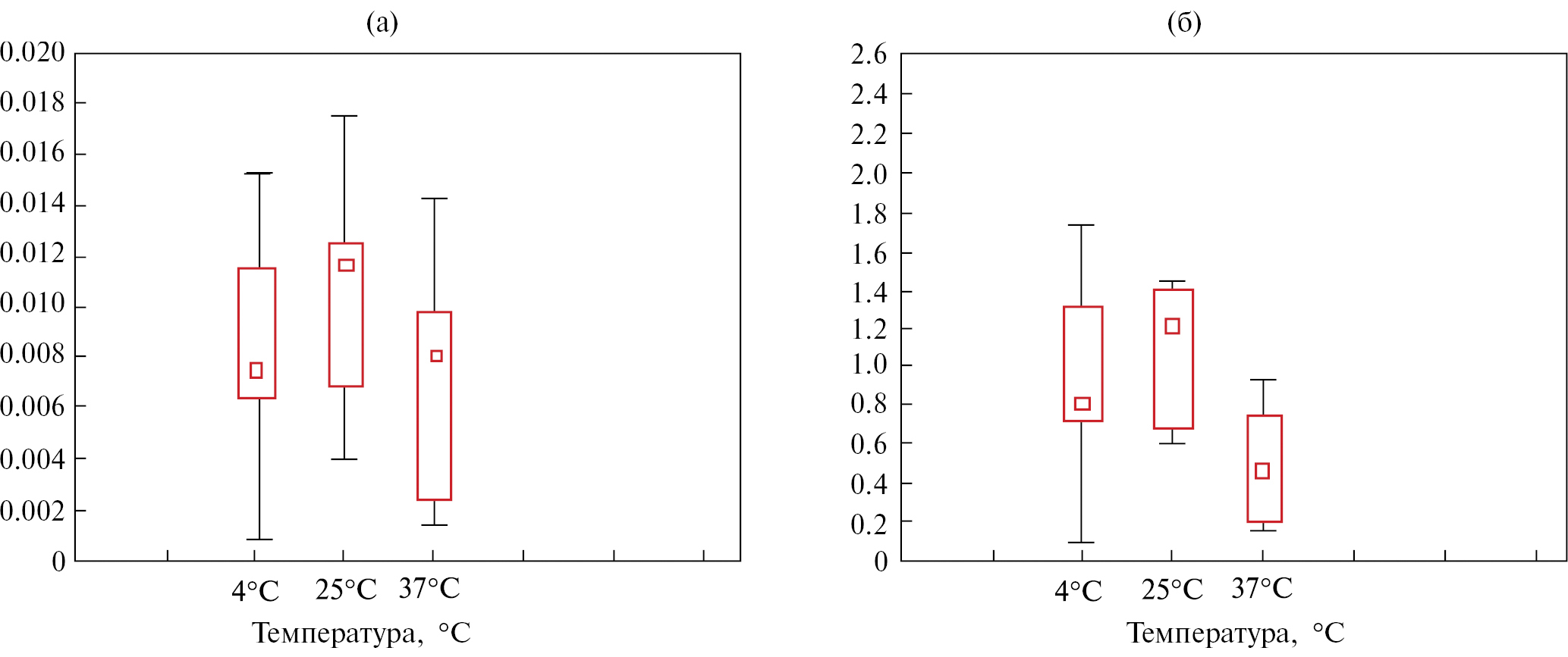 Таким образом, в пещере Мраморная присутствуют как психротолерантные, так и эвритермные бактерии рода Pseudomonas. При этом психротолерантные бактерии являются преобладающими формами, среди исследуемых штаммов. Это подтверждается низким уровнем удельной скорости роста при 37℃ в сравнении с удельной скоростью роста при 4 и 25℃ (рис. 4а), где диапазон средних значений удельной скорости роста основного пула исследуемых штаммов составил от 0.0023 до 0.0098 ч-1 (при 37℃) и от 0.0065 до 0.0125 ч-1 (при 4 и 25℃).