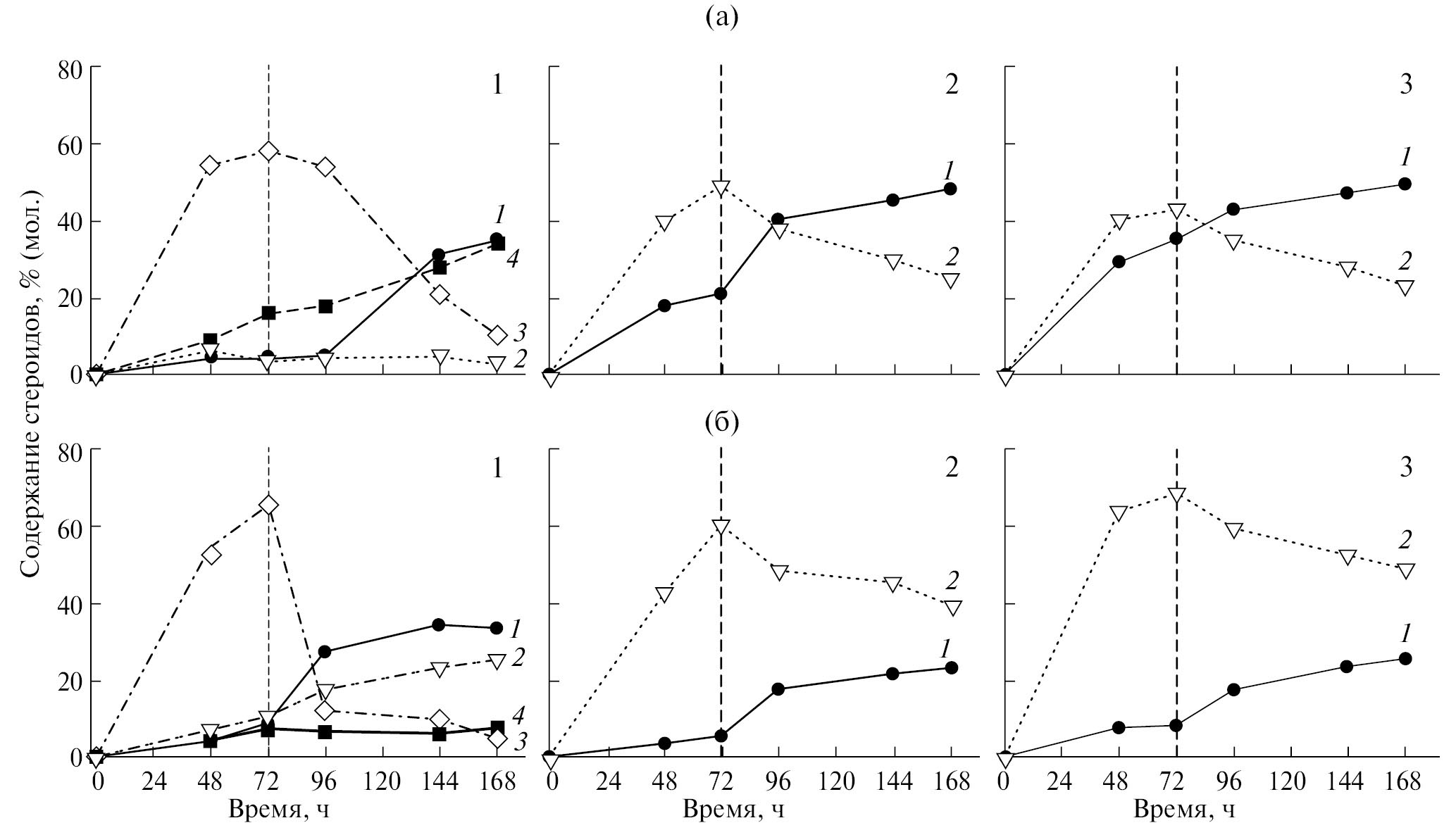 Рис. 1. Трансформация 5 г/л фитостерина родительскими штаммами M. neoaurum ВКМ Ас-1816D (1б), ВКМ Ас-1815D (2б), NRRL B-3805 ΔkstD (3б) и рекомбинантными штаммами, несущими бицистронную генетическую конструкцию под регуляцией конститутивного промотора, созданными на их основе (1а, 2а, 3а, соответственно). Вертикальной пунктирной чертой обозначен момент перехода из окислительного в восстановительный режим. 1 — Т; 2 — АД; 3 — АДД; 4 — дТ.