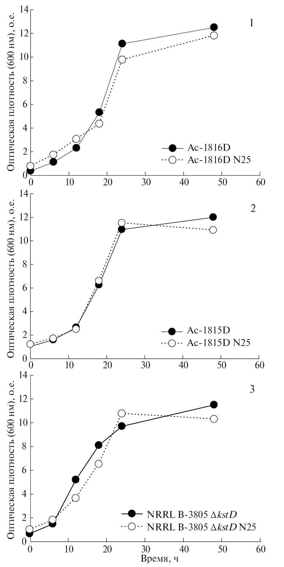 Рис. S 2. Динамика роста родительских штаммов M. neoaurum ВКМ Ас-١٨١٥D (١), Ас-١٨١٦D ( 2), NRRL B-٣٨٠٥ ΔkstD (3) и рекомбинантных штаммов, созданных на их основе путем трансформации плазмидой pMVN25 (N25)