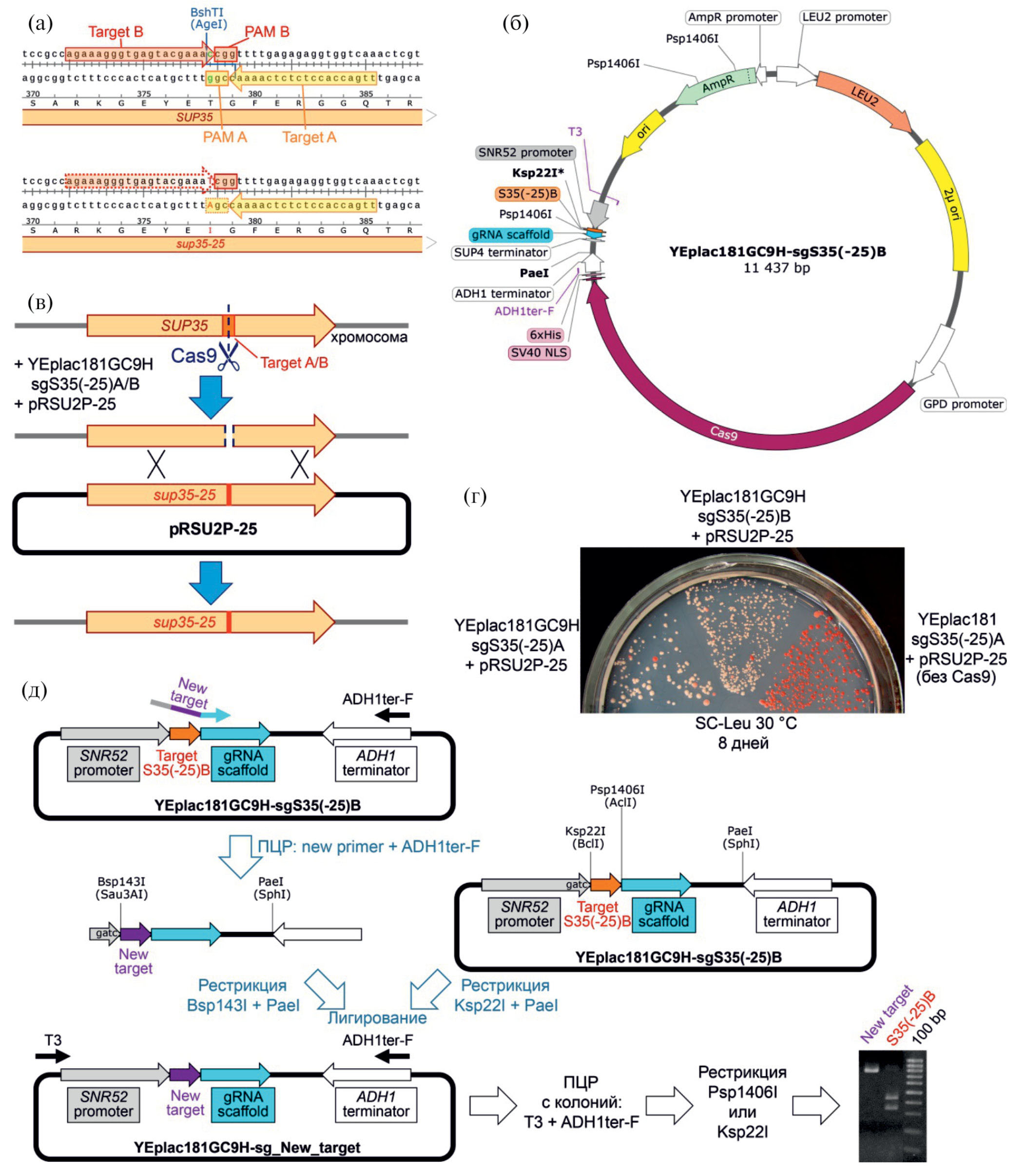Рис. 1. Создание удобной системы клонирования мишеней в вектор для редактирования генома Saccharomyces cerevisiae с помощью CRISPR-Cas9. (а) — Cхема расположения мутации sup35-25 и мишеней S35(-25) A и S35(-25) B в гене SUP35. (б) — Карта плазмиды YEplac181GC9H-sgS35(-25) B; создана с помощью программы SnapGene Viewer. (в) — Схема получения мутантов sup35-25. (г) — Рост колоний штамма 74-D694, трансформированного плазмидами в указанных комбинациях. (д) — Схема клонирования новых мишеней в вектор YEplac181GC9H-sgS35(-25) B и отбора колоний E. coli, несущих корректно сконструированный новый вектор.