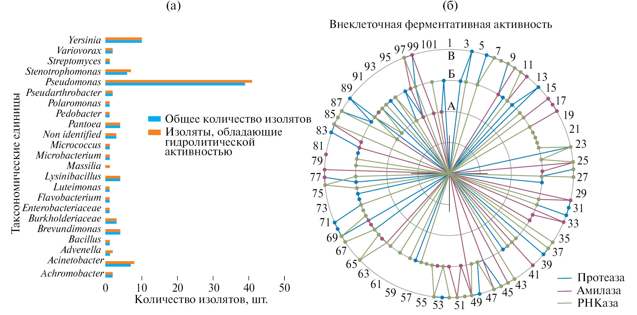 Самой высокой протеазной активностью обладали представители родов Pseudomonas, Stenotrophomonas, Bacillus, Acinetobacter и Yersinia. Изоляты родов Pseudomonas, Bacillus, Yersinia, Acinetobacter, Lysinibacillus, Polaromonas и Caulobacter показали наибольший уровень активности РНКазы, а родов Pseudomonas, Serratia, Yersinia и Acinetobacter — амилазы.
