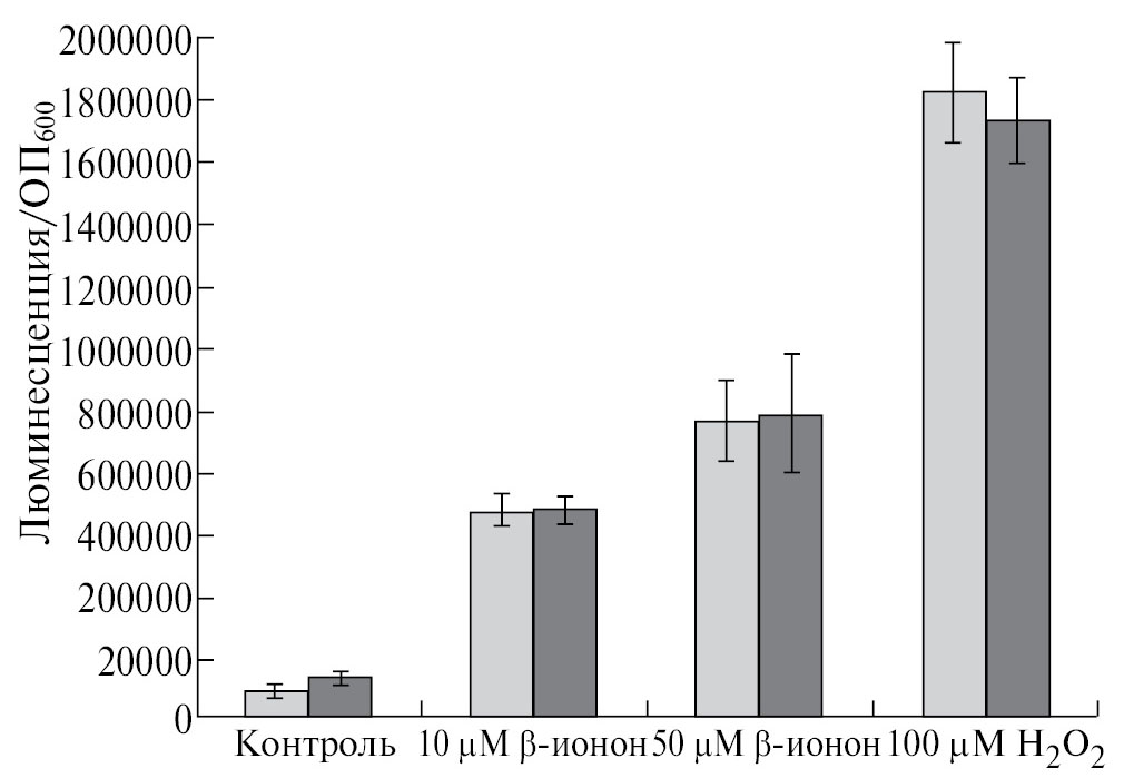 С целью изучения механизмов действия β-ионона на бактерии мы использовали специфические люминесцентные lux-биосенсоры на основе штаммов Escherichia coli, которые содержат индуцируемые промоторы, реагирующие на окислительный стресс, повреждение ДНК и белков, транскрипционно слитые с репортерными генами luxCDABE бактерии Photorhabdus luminescens (Kotova et al., 2010).