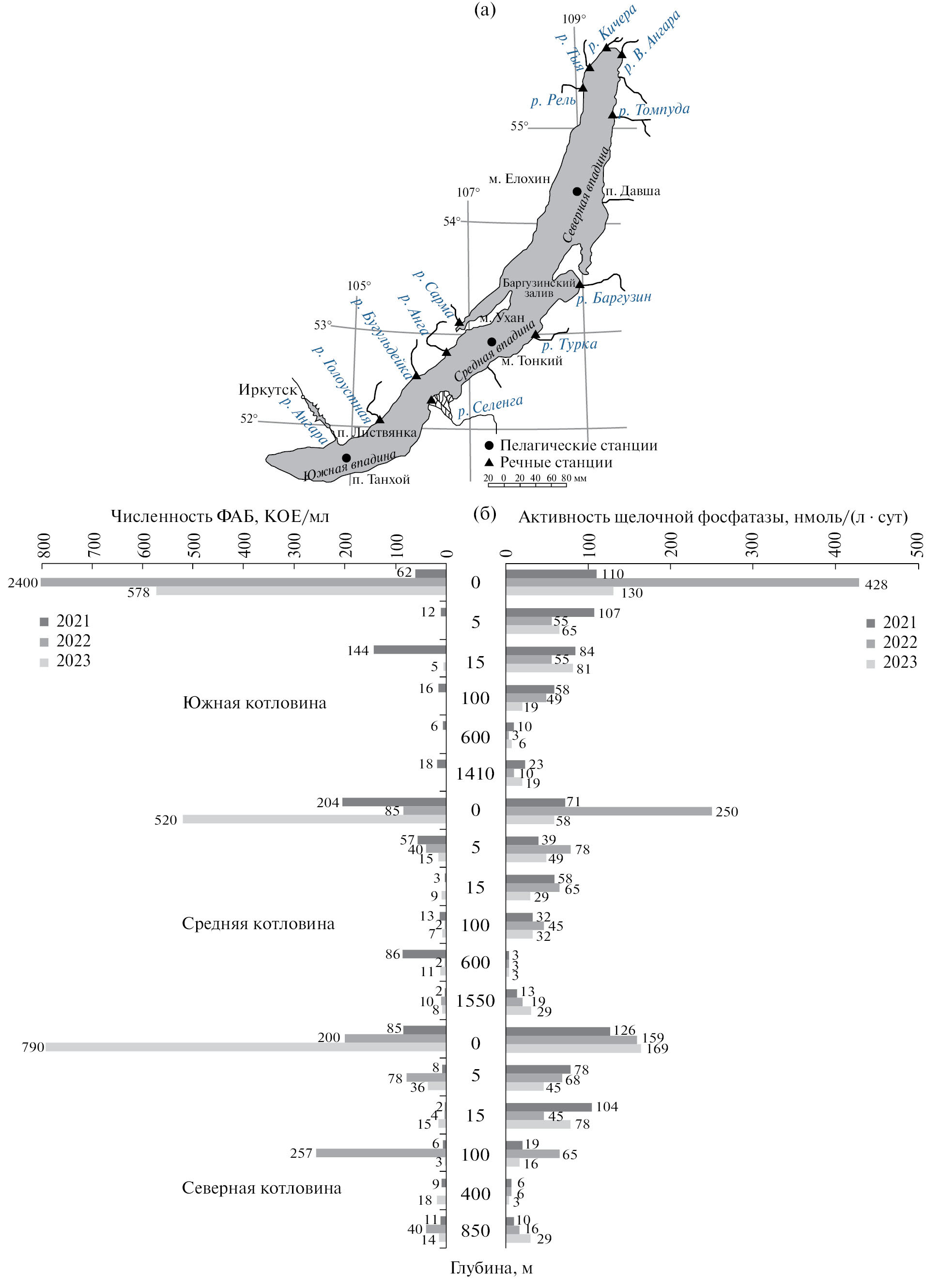 Рис. 1. Карта станций отбора проб (а); Численность ФАБ и АЩФ в водной толще южной, средней и северной котловин оз. Байкал в июне 2021‒2023 гг. (б).