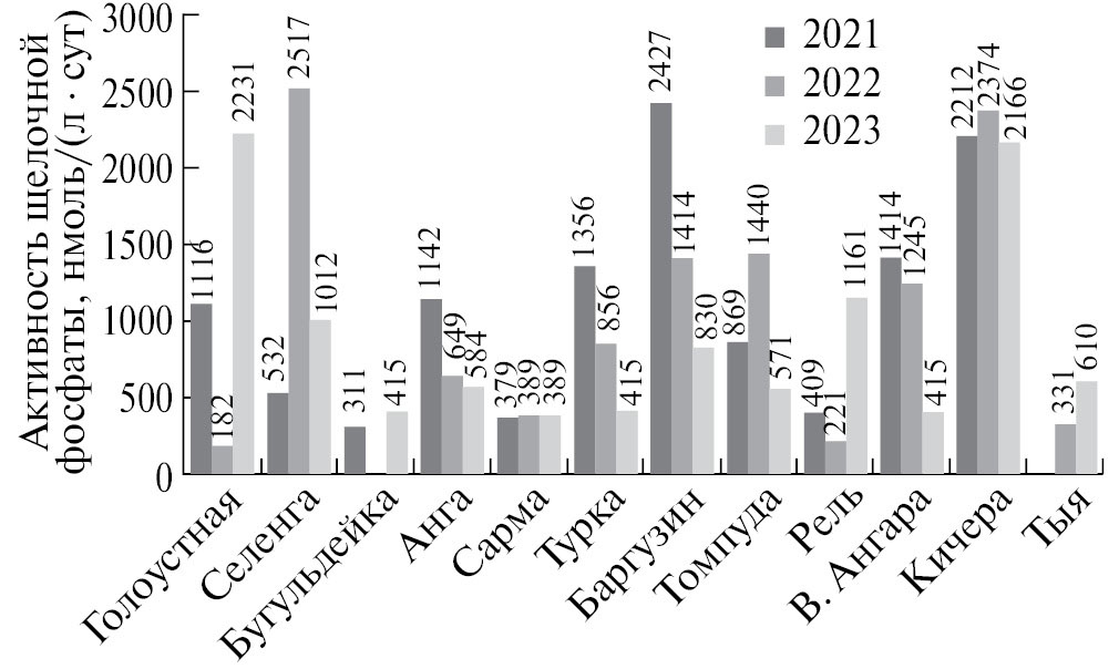 Стабильно высокие значения наблюдали все три года на р. Кичера, где АЩФ составила 2212, 2374 и 2166 нмоль/(л·сут), соответственно, и стабильно низкие значения в р. Бугульдейка и р. Сарма — в среднем 408 нмоль/(л·сут) (рис. 2). Также выявили значимую корреляционную связь значений АЩФ с содержанием органического фосфора (r = 0.8; p ≤ 0.05), концентрация которого в среднем составила 0.019 мкг/л, с минимальными значениями в р. Сарма (0.004‒0.005 мкг/л) и максимальными в р. Баргузин (0.72 мкг/л).