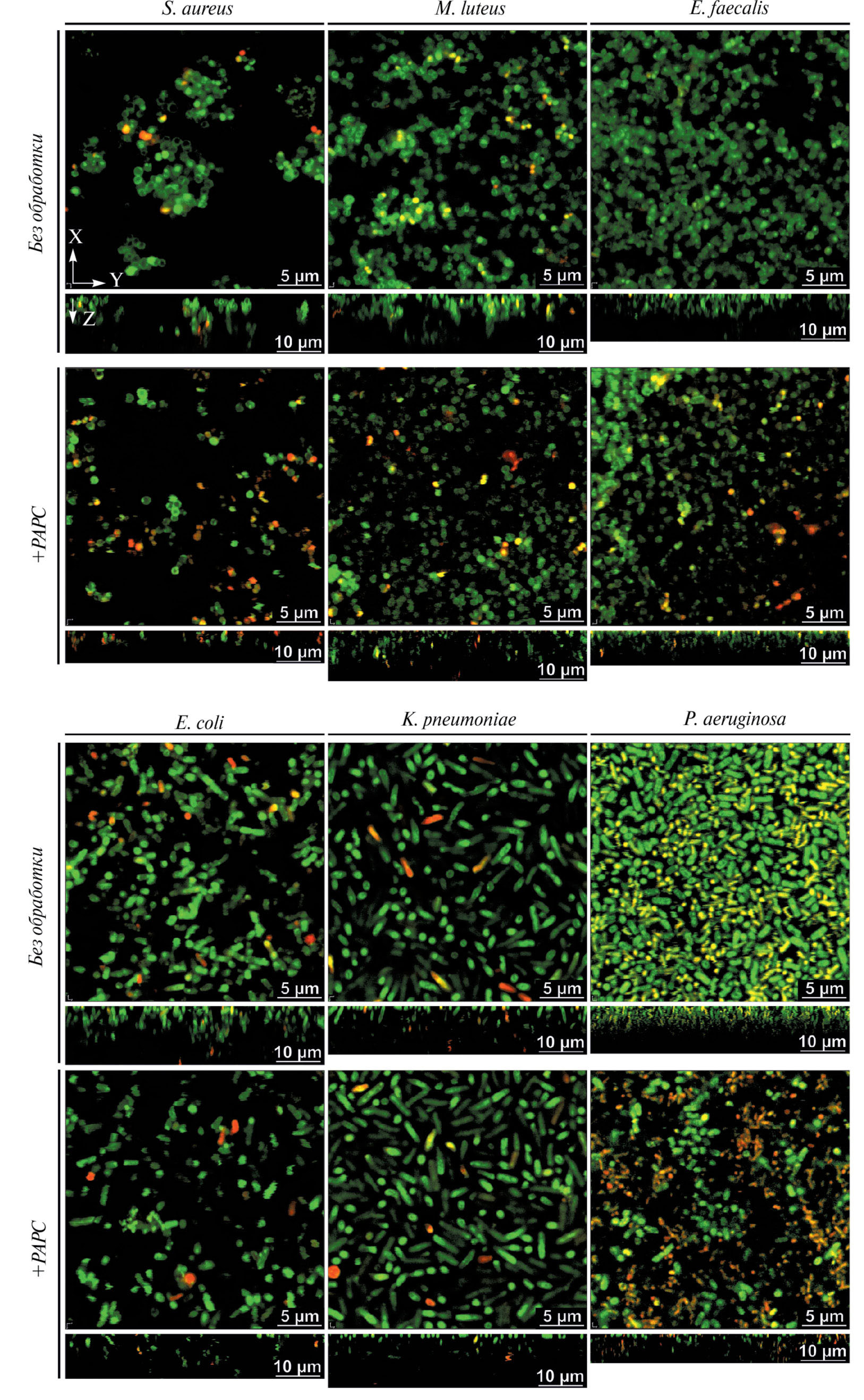 Рис. 2. Влияние PAPC (100 мкг/мл) на целостность биопленки и эффективность против клеток S. aureus, M. luteus, E. faecalis, E. coli, K. pneumoniae и P. aeruginosa в составе сформированной биопленки. На микрофотографиях масштабная метка соответствует 5 мкм, на Z-срезах — 10 мкм.